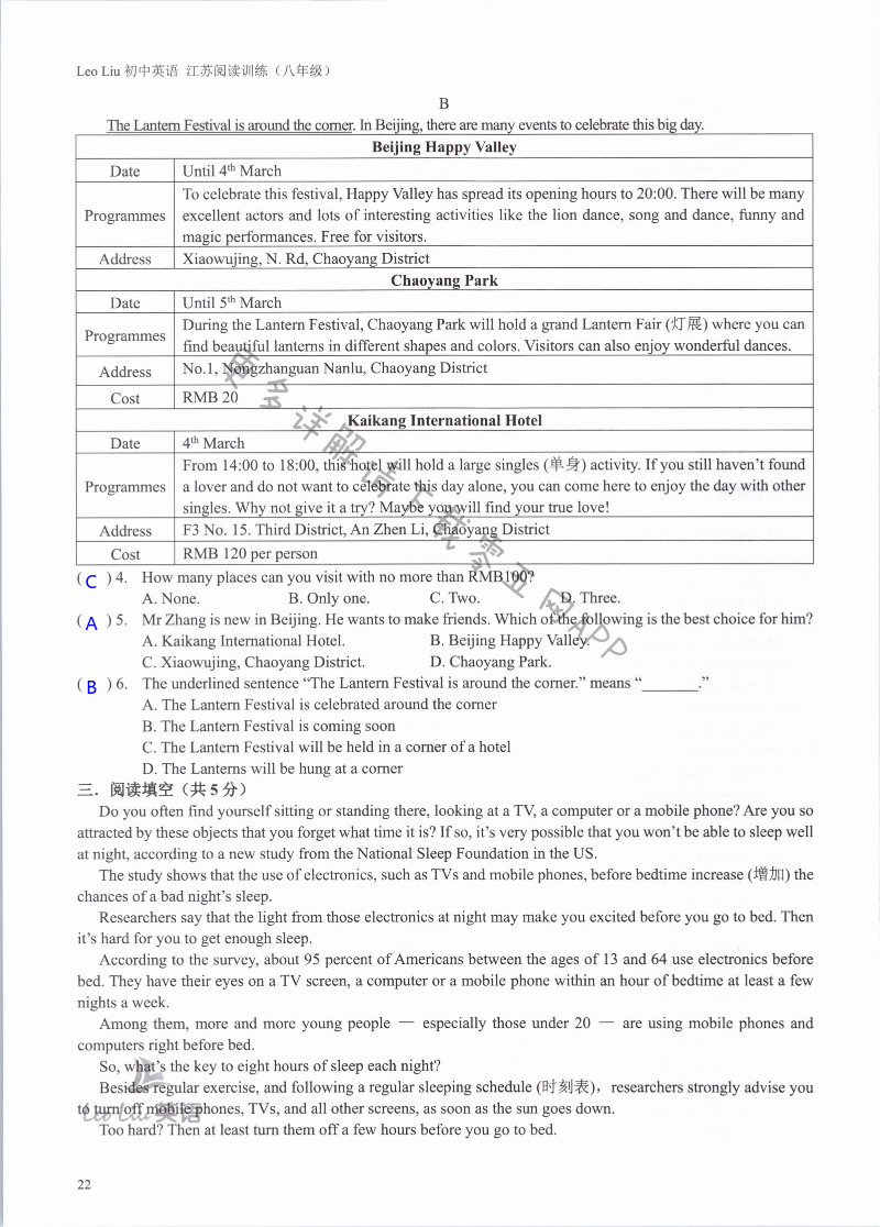 注:目前有些书本章节名称可能整理的还不是很完善,但都是按照顺序排列的,请同学们按照顺序仔细查找。练习册 2021年LeoLiu初中英语八年级听力训练阅读训练 答案主要是用来给同学们做完题方便对答案用的,请勿直接抄袭。