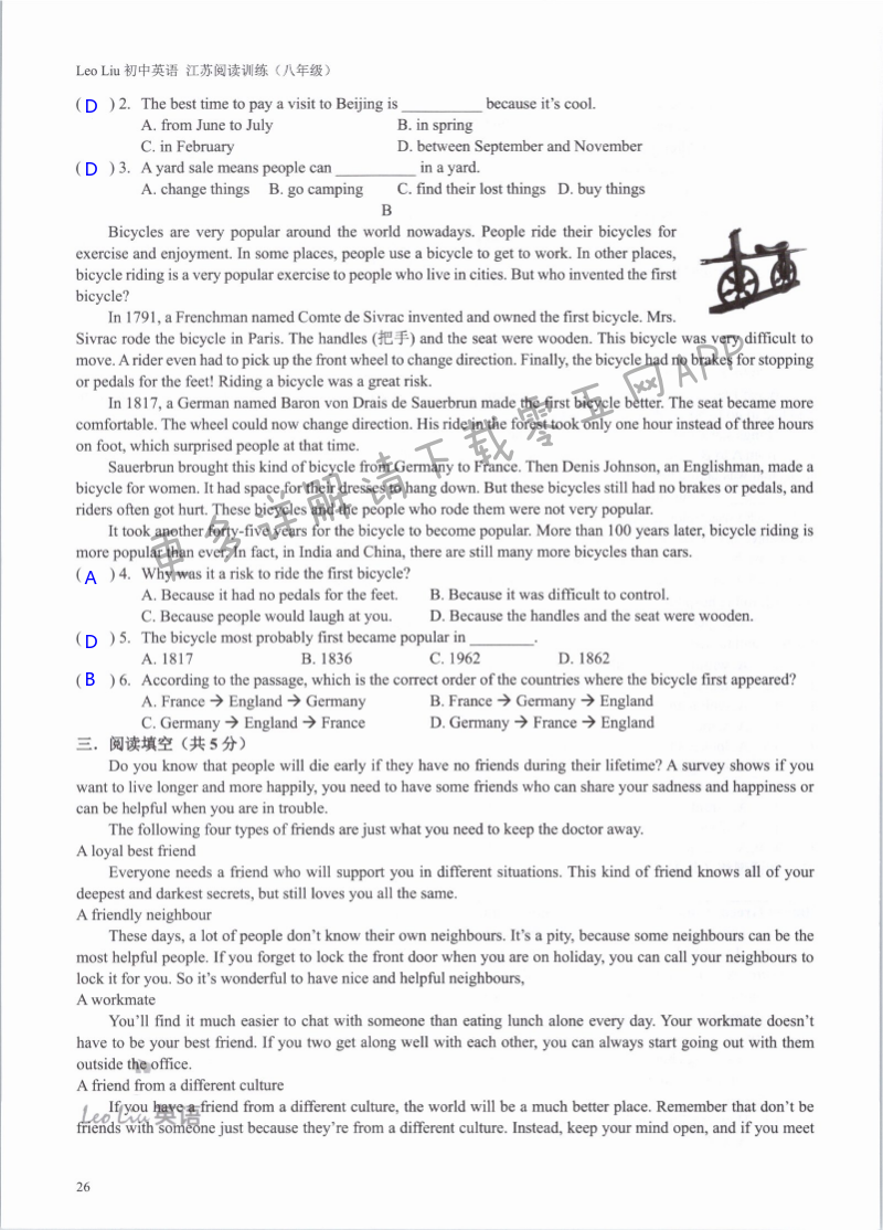 注:目前有些书本章节名称可能整理的还不是很完善,但都是按照顺序排列的,请同学们按照顺序仔细查找。练习册 2021年LeoLiu初中英语八年级听力训练阅读训练 答案主要是用来给同学们做完题方便对答案用的,请勿直接抄袭。