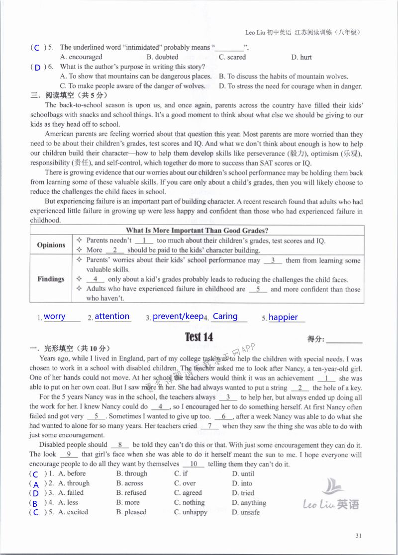 注:目前有些书本章节名称可能整理的还不是很完善,但都是按照顺序排列的,请同学们按照顺序仔细查找。练习册 2021年LeoLiu初中英语八年级听力训练阅读训练 答案主要是用来给同学们做完题方便对答案用的,请勿直接抄袭。