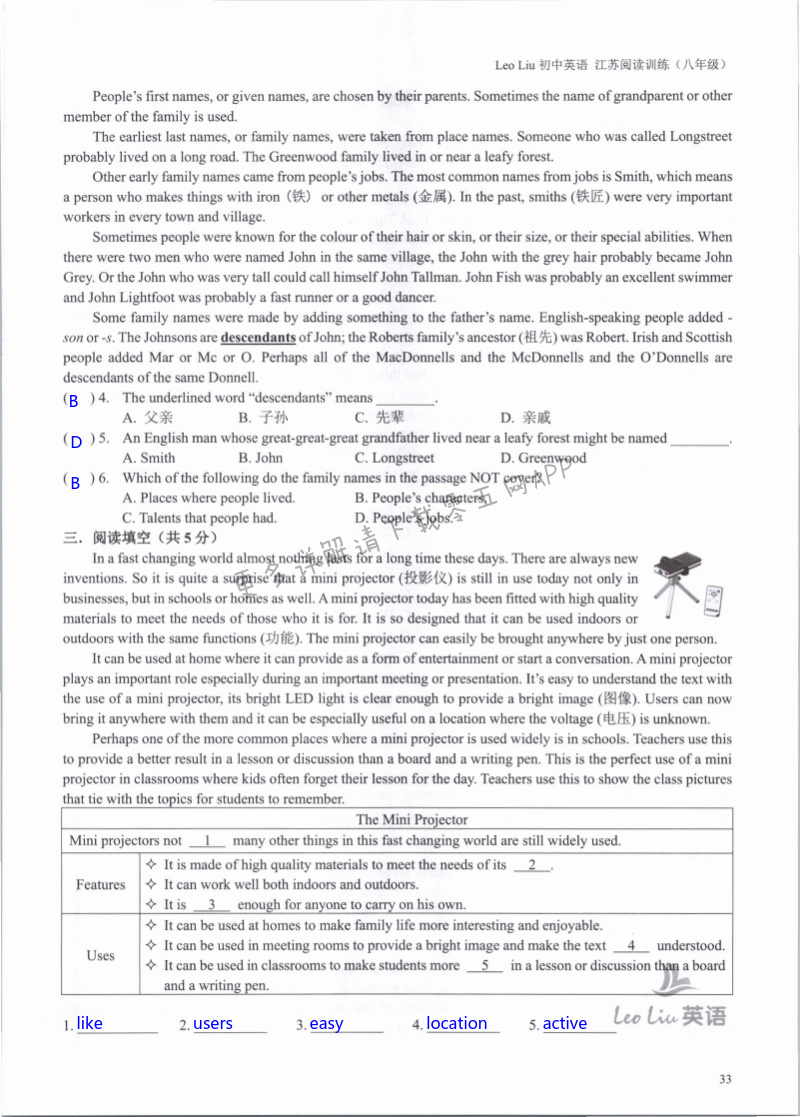 注:目前有些书本章节名称可能整理的还不是很完善,但都是按照顺序排列的,请同学们按照顺序仔细查找。练习册 2021年LeoLiu初中英语八年级听力训练阅读训练 答案主要是用来给同学们做完题方便对答案用的,请勿直接抄袭。