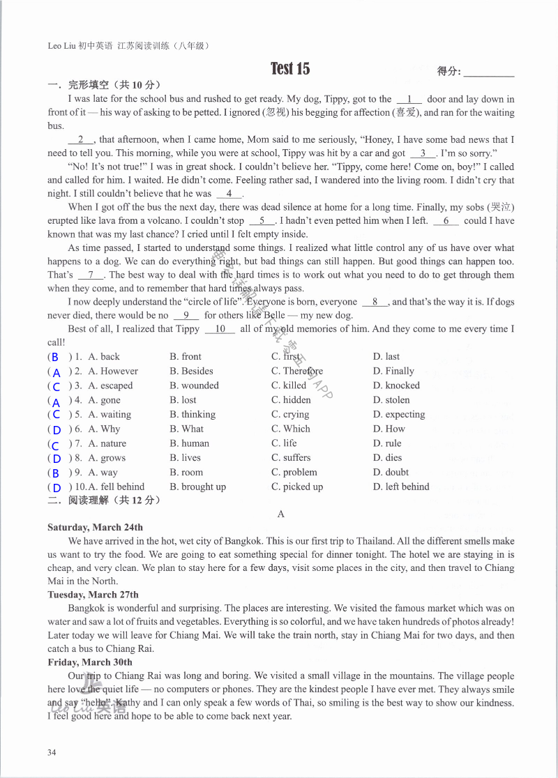注:目前有些书本章节名称可能整理的还不是很完善,但都是按照顺序排列的,请同学们按照顺序仔细查找。练习册 2021年LeoLiu初中英语八年级听力训练阅读训练 答案主要是用来给同学们做完题方便对答案用的,请勿直接抄袭。