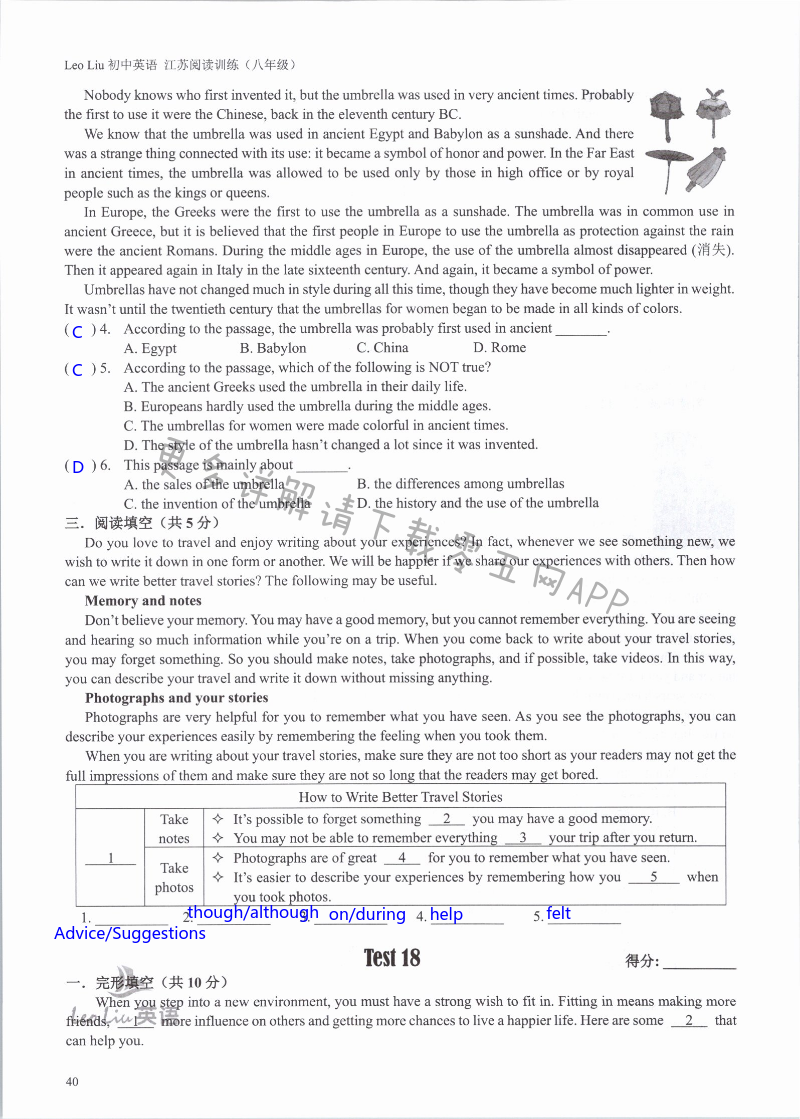 注:目前有些书本章节名称可能整理的还不是很完善,但都是按照顺序排列的,请同学们按照顺序仔细查找。练习册 2021年LeoLiu初中英语八年级听力训练阅读训练 答案主要是用来给同学们做完题方便对答案用的,请勿直接抄袭。