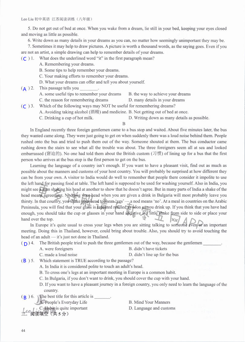 注:目前有些书本章节名称可能整理的还不是很完善,但都是按照顺序排列的,请同学们按照顺序仔细查找。练习册 2021年LeoLiu初中英语八年级听力训练阅读训练 答案主要是用来给同学们做完题方便对答案用的,请勿直接抄袭。