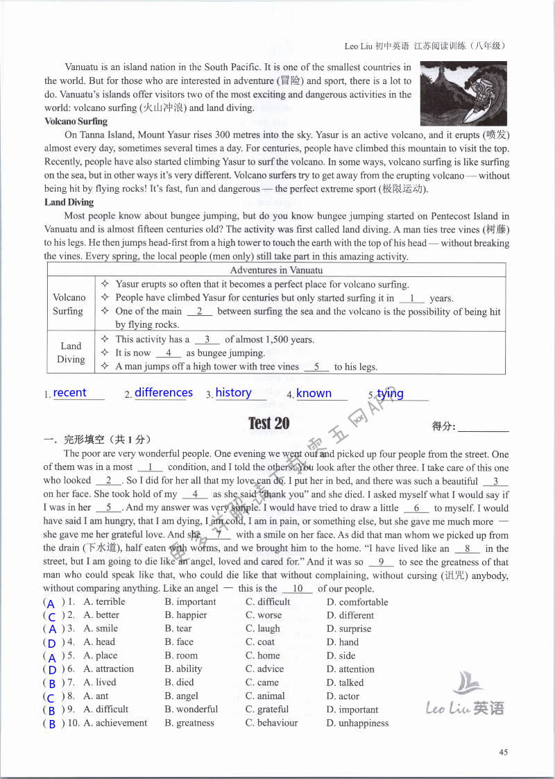 注:目前有些书本章节名称可能整理的还不是很完善,但都是按照顺序排列的,请同学们按照顺序仔细查找。练习册 2021年LeoLiu初中英语八年级听力训练阅读训练 答案主要是用来给同学们做完题方便对答案用的,请勿直接抄袭。