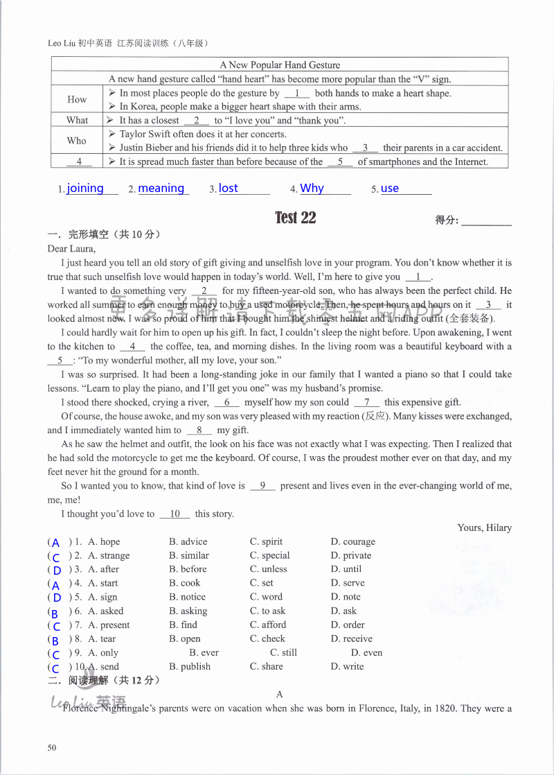 注:目前有些书本章节名称可能整理的还不是很完善,但都是按照顺序排列的,请同学们按照顺序仔细查找。练习册 2021年LeoLiu初中英语八年级听力训练阅读训练 答案主要是用来给同学们做完题方便对答案用的,请勿直接抄袭。