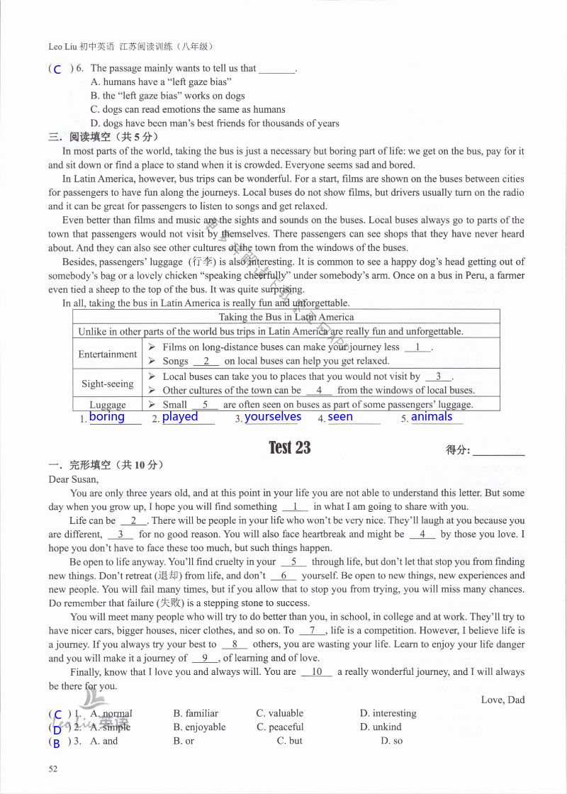 注:目前有些书本章节名称可能整理的还不是很完善,但都是按照顺序排列的,请同学们按照顺序仔细查找。练习册 2021年LeoLiu初中英语八年级听力训练阅读训练 答案主要是用来给同学们做完题方便对答案用的,请勿直接抄袭。