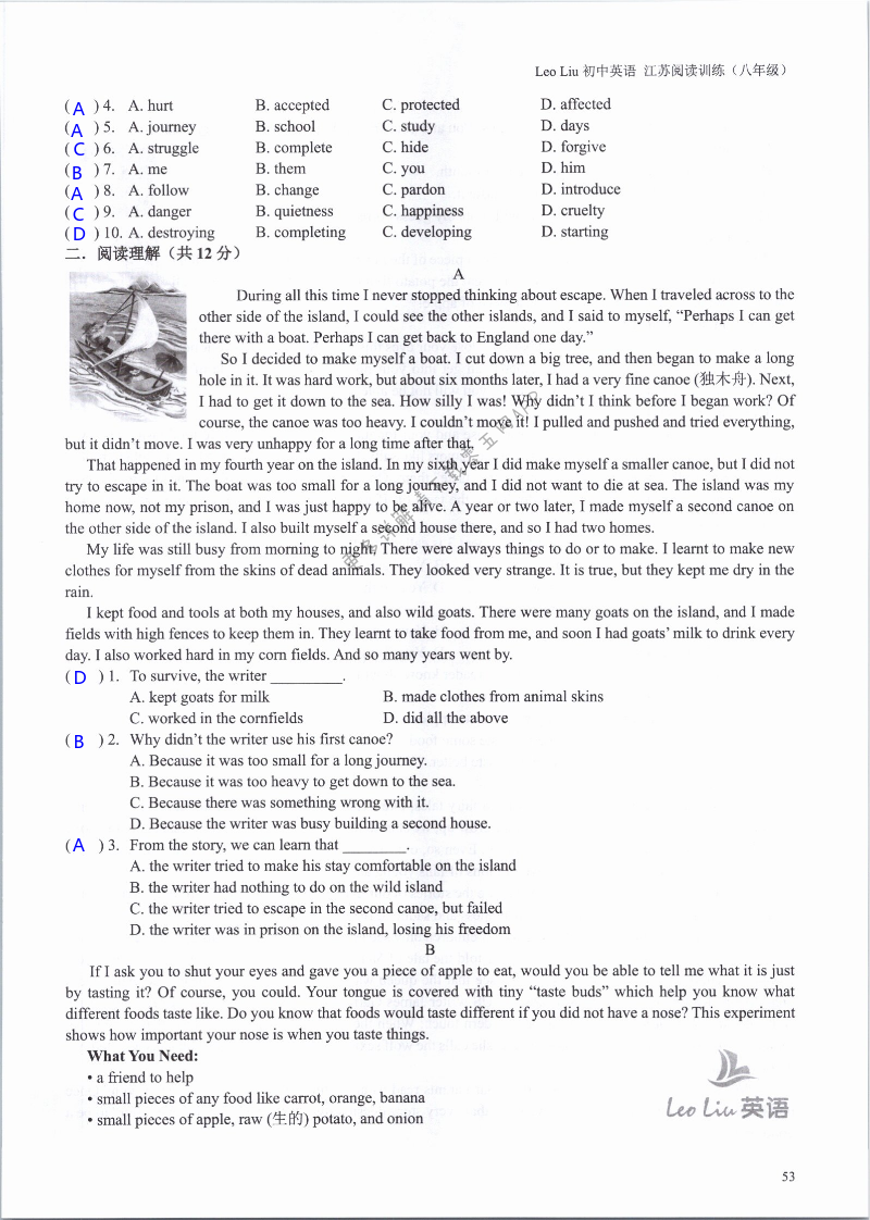 注:目前有些书本章节名称可能整理的还不是很完善,但都是按照顺序排列的,请同学们按照顺序仔细查找。练习册 2021年LeoLiu初中英语八年级听力训练阅读训练 答案主要是用来给同学们做完题方便对答案用的,请勿直接抄袭。