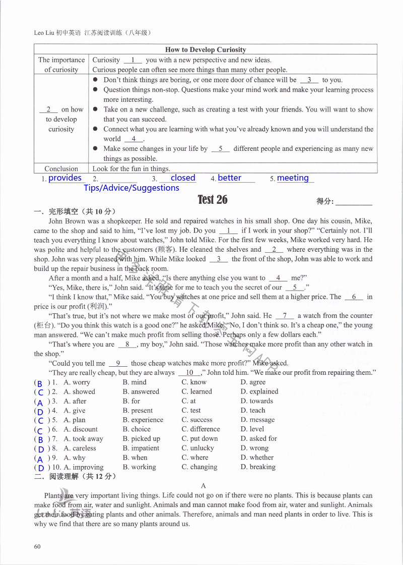 注:目前有些书本章节名称可能整理的还不是很完善,但都是按照顺序排列的,请同学们按照顺序仔细查找。练习册 2021年LeoLiu初中英语八年级听力训练阅读训练 答案主要是用来给同学们做完题方便对答案用的,请勿直接抄袭。