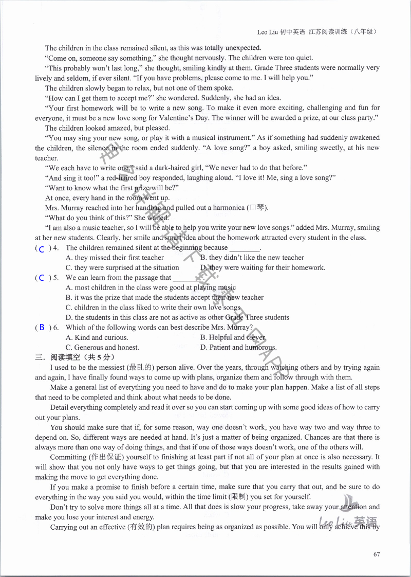 注:目前有些书本章节名称可能整理的还不是很完善,但都是按照顺序排列的,请同学们按照顺序仔细查找。练习册 2021年LeoLiu初中英语八年级听力训练阅读训练 答案主要是用来给同学们做完题方便对答案用的,请勿直接抄袭。