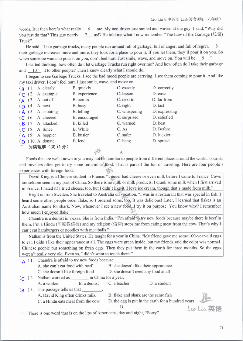 注:目前有些书本章节名称可能整理的还不是很完善,但都是按照顺序排列的,请同学们按照顺序仔细查找。练习册 2021年LeoLiu初中英语八年级听力训练阅读训练 答案主要是用来给同学们做完题方便对答案用的,请勿直接抄袭。