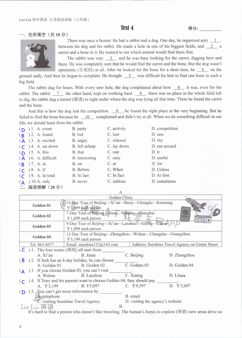 注:目前有些书本章节名称可能整理的还不是很完善,但都是按照顺序排列的,请同学们按照顺序仔细查找。练习册 2021年LeoLiu初中英语八年级听力训练阅读训练 答案主要是用来给同学们做完题方便对答案用的,请勿直接抄袭。