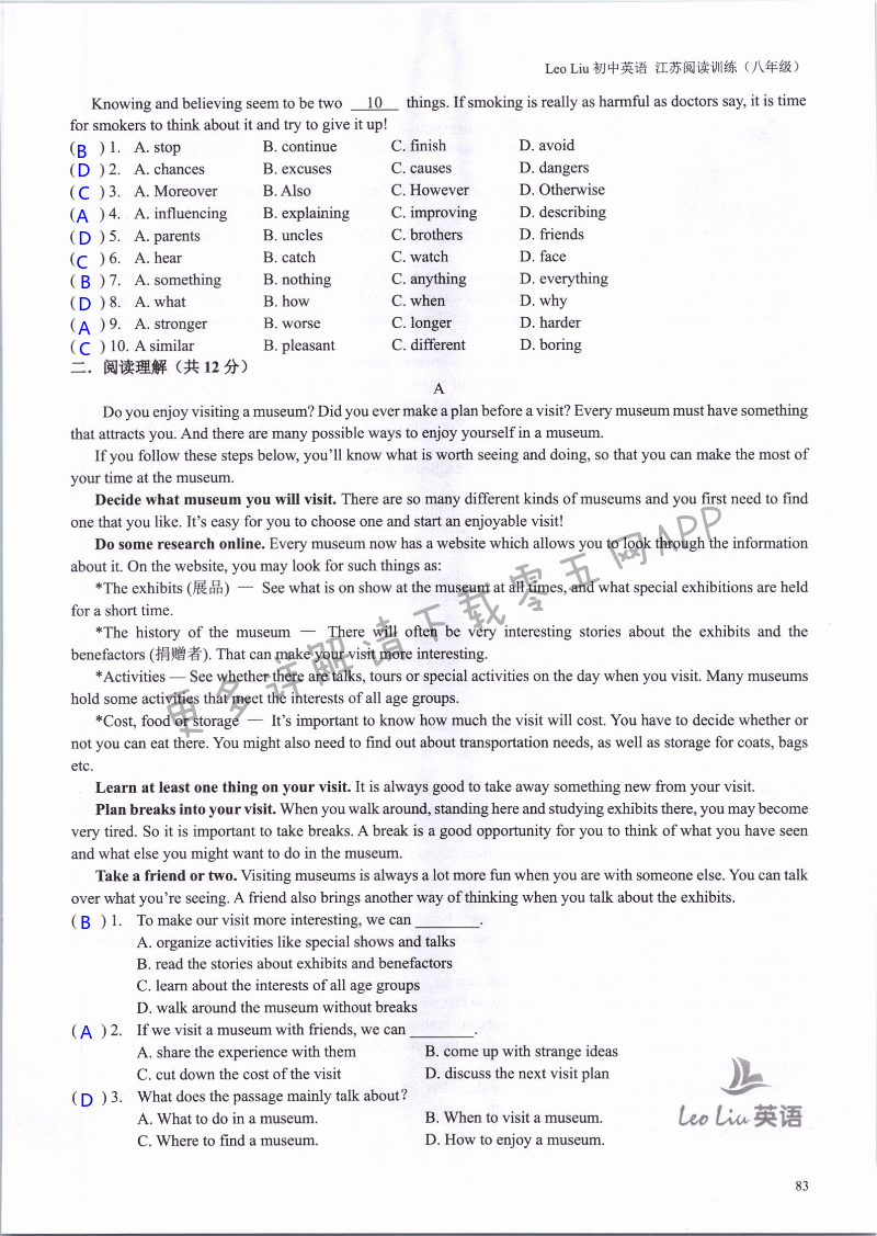 注:目前有些书本章节名称可能整理的还不是很完善,但都是按照顺序排列的,请同学们按照顺序仔细查找。练习册 2021年LeoLiu初中英语八年级听力训练阅读训练 答案主要是用来给同学们做完题方便对答案用的,请勿直接抄袭。