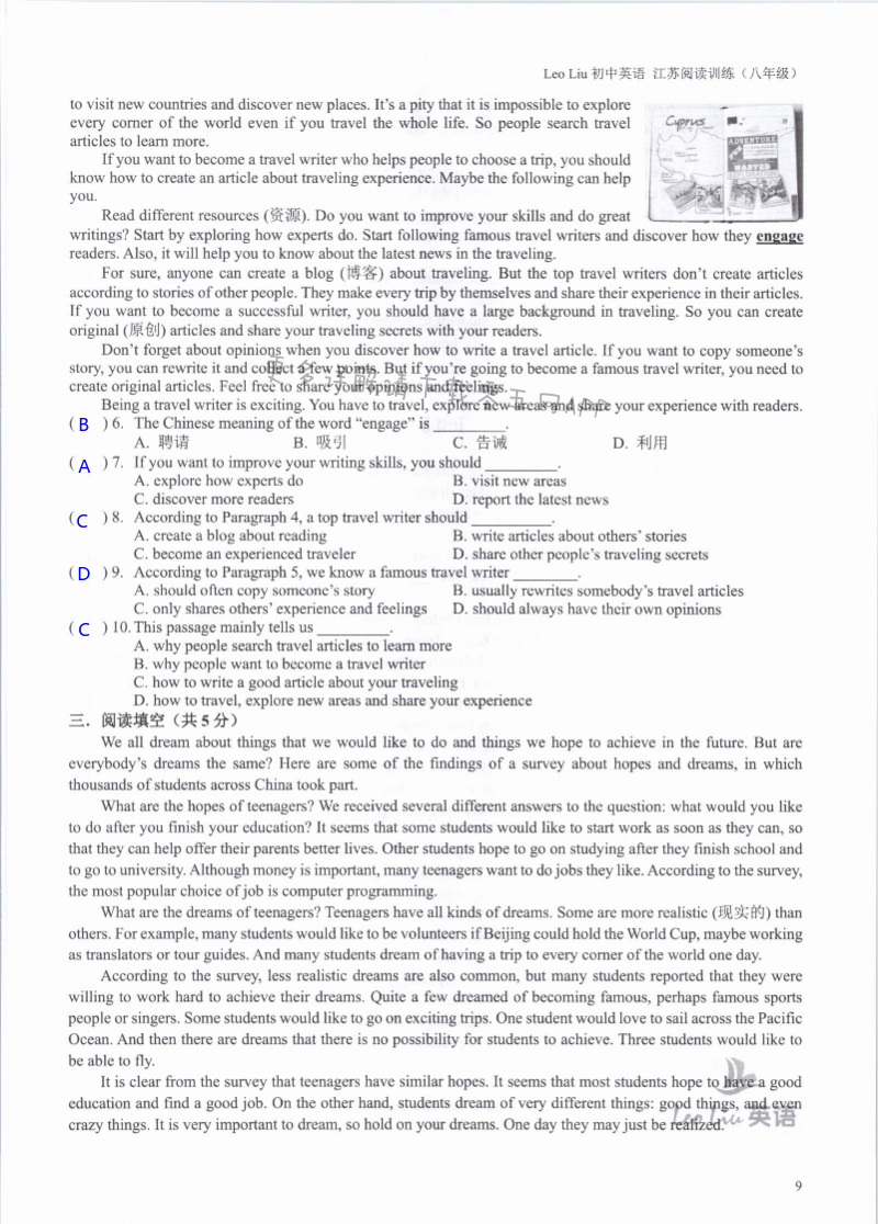 注:目前有些书本章节名称可能整理的还不是很完善,但都是按照顺序排列的,请同学们按照顺序仔细查找。练习册 2021年LeoLiu初中英语八年级听力训练阅读训练 答案主要是用来给同学们做完题方便对答案用的,请勿直接抄袭。