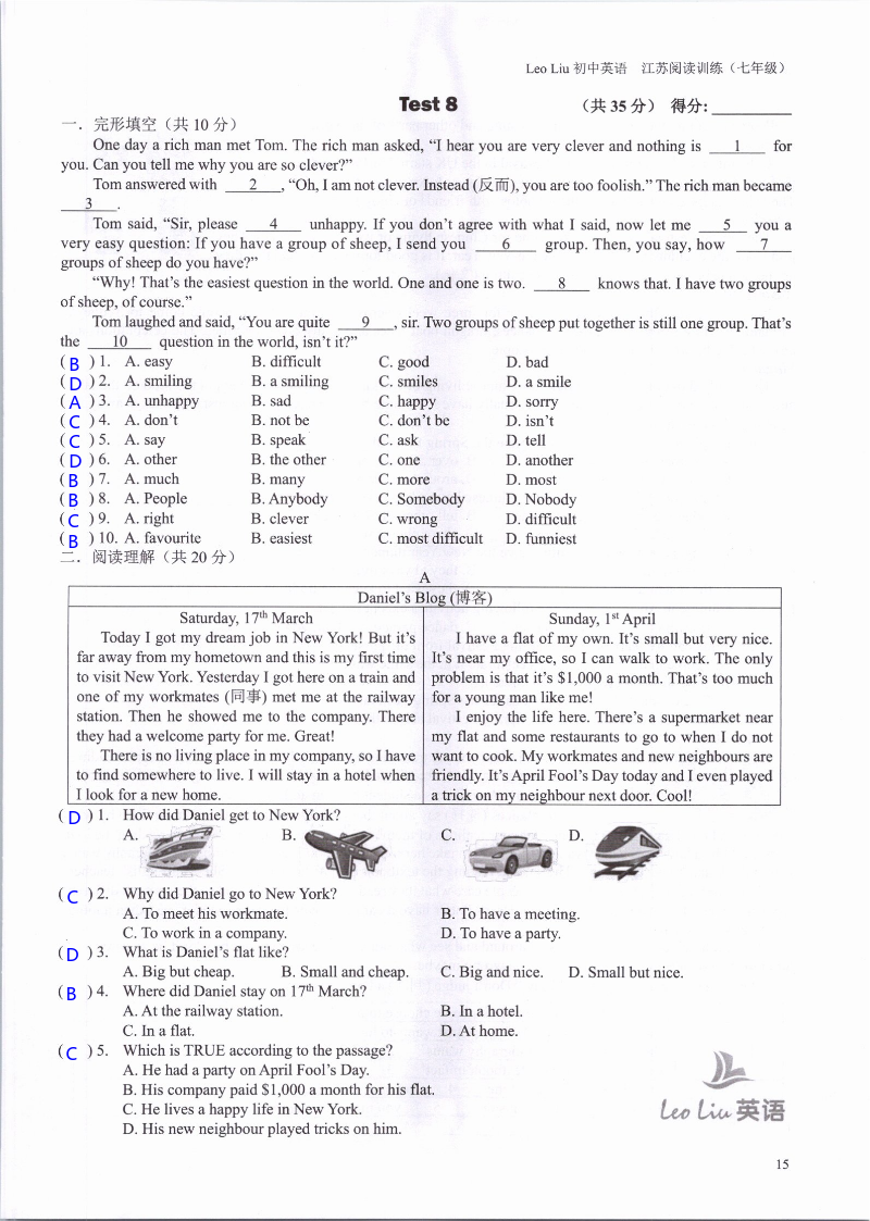 注:目前有些书本章节名称可能整理的还不是很完善,但都是按照顺序排列的,请同学们按照顺序仔细查找。练习册 2021年LeoLiu初中英语七年级听力训练阅读训练 答案主要是用来给同学们做完题方便对答案用的,请勿直接抄袭。