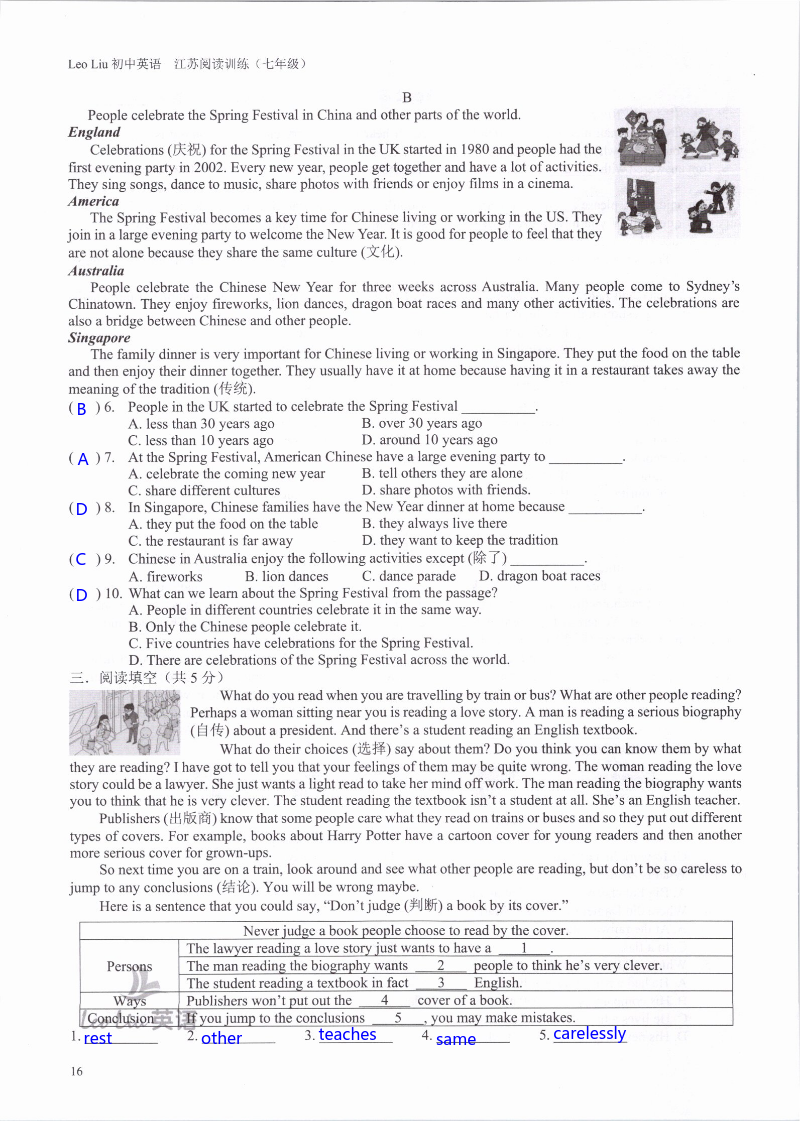 注:目前有些书本章节名称可能整理的还不是很完善,但都是按照顺序排列的,请同学们按照顺序仔细查找。练习册 2021年LeoLiu初中英语七年级听力训练阅读训练 答案主要是用来给同学们做完题方便对答案用的,请勿直接抄袭。
