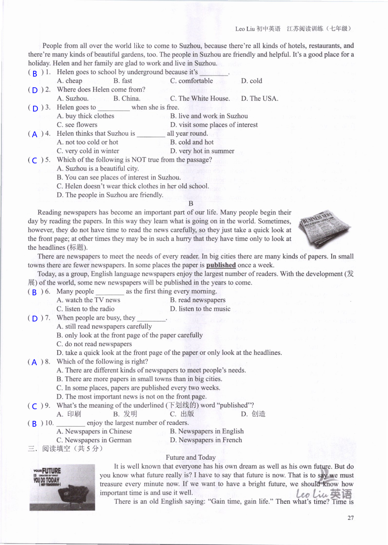 注:目前有些书本章节名称可能整理的还不是很完善,但都是按照顺序排列的,请同学们按照顺序仔细查找。练习册 2021年LeoLiu初中英语七年级听力训练阅读训练 答案主要是用来给同学们做完题方便对答案用的,请勿直接抄袭。