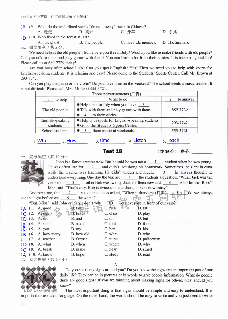 注:目前有些书本章节名称可能整理的还不是很完善,但都是按照顺序排列的,请同学们按照顺序仔细查找。练习册 2021年LeoLiu初中英语七年级听力训练阅读训练 答案主要是用来给同学们做完题方便对答案用的,请勿直接抄袭。