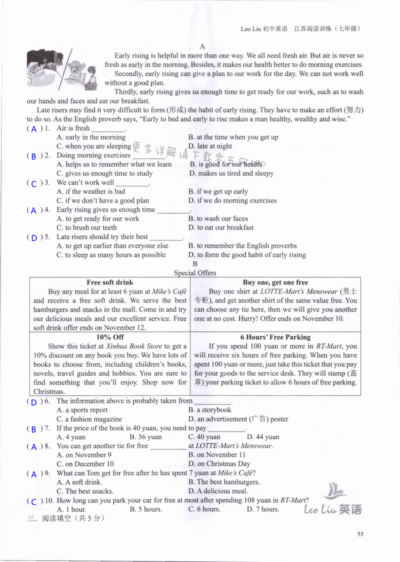 注:目前有些书本章节名称可能整理的还不是很完善,但都是按照顺序排列的,请同学们按照顺序仔细查找。练习册 2021年LeoLiu初中英语七年级听力训练阅读训练 答案主要是用来给同学们做完题方便对答案用的,请勿直接抄袭。