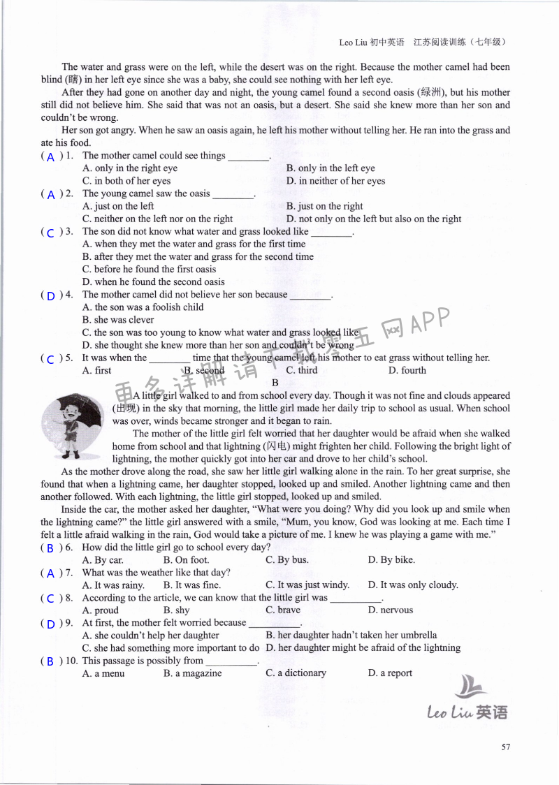 注:目前有些书本章节名称可能整理的还不是很完善,但都是按照顺序排列的,请同学们按照顺序仔细查找。练习册 2021年LeoLiu初中英语七年级听力训练阅读训练 答案主要是用来给同学们做完题方便对答案用的,请勿直接抄袭。