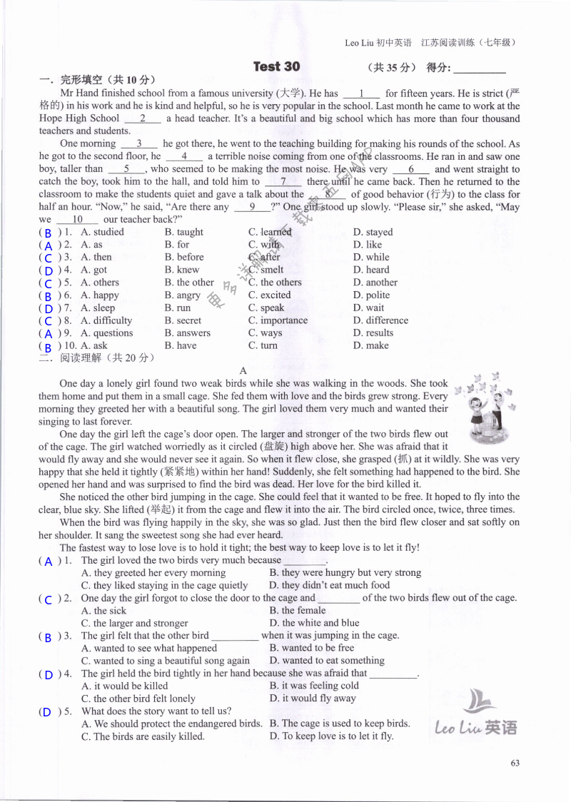 注:目前有些书本章节名称可能整理的还不是很完善,但都是按照顺序排列的,请同学们按照顺序仔细查找。练习册 2021年LeoLiu初中英语七年级听力训练阅读训练 答案主要是用来给同学们做完题方便对答案用的,请勿直接抄袭。