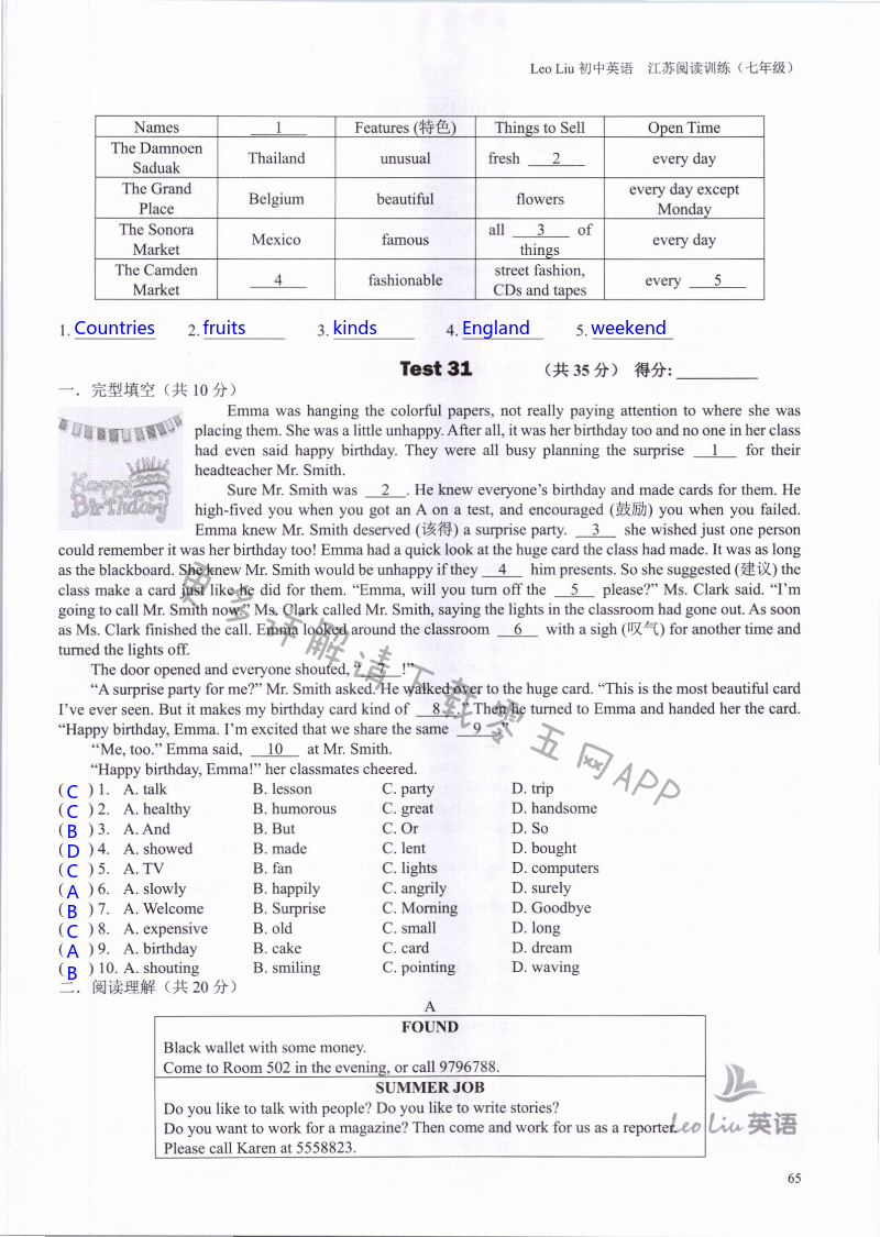 注:目前有些书本章节名称可能整理的还不是很完善,但都是按照顺序排列的,请同学们按照顺序仔细查找。练习册 2021年LeoLiu初中英语七年级听力训练阅读训练 答案主要是用来给同学们做完题方便对答案用的,请勿直接抄袭。