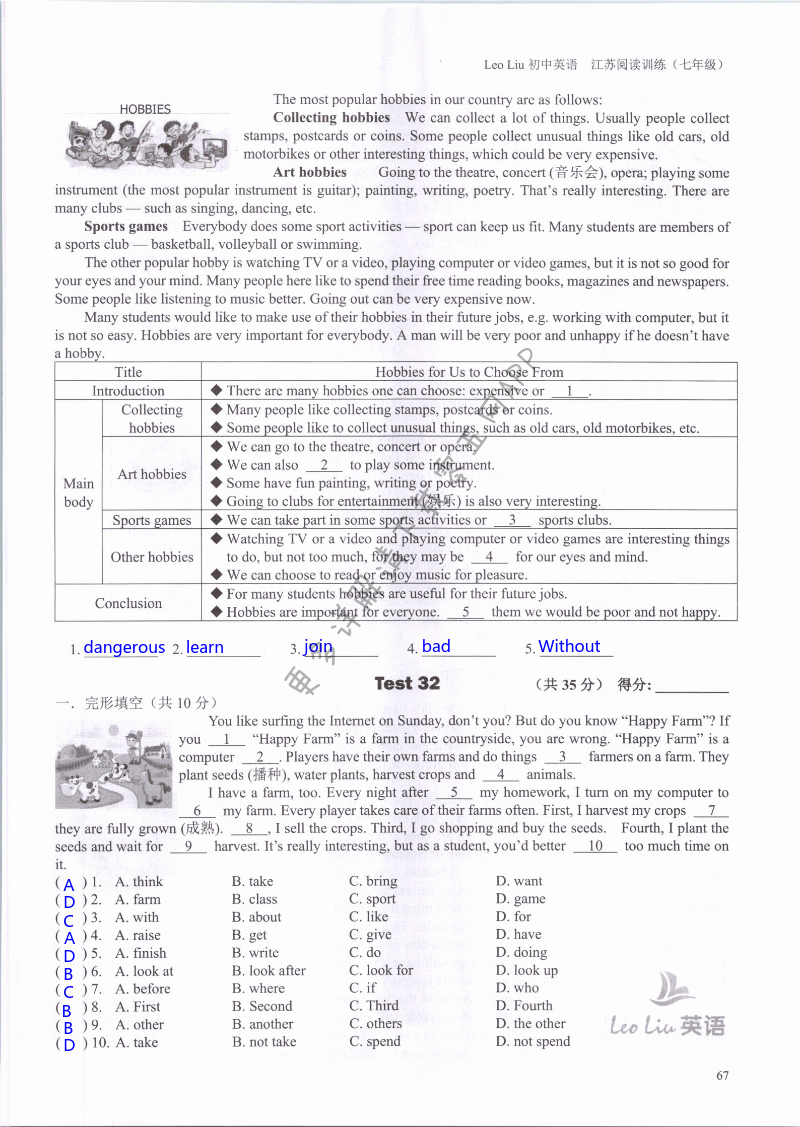 注:目前有些书本章节名称可能整理的还不是很完善,但都是按照顺序排列的,请同学们按照顺序仔细查找。练习册 2021年LeoLiu初中英语七年级听力训练阅读训练 答案主要是用来给同学们做完题方便对答案用的,请勿直接抄袭。