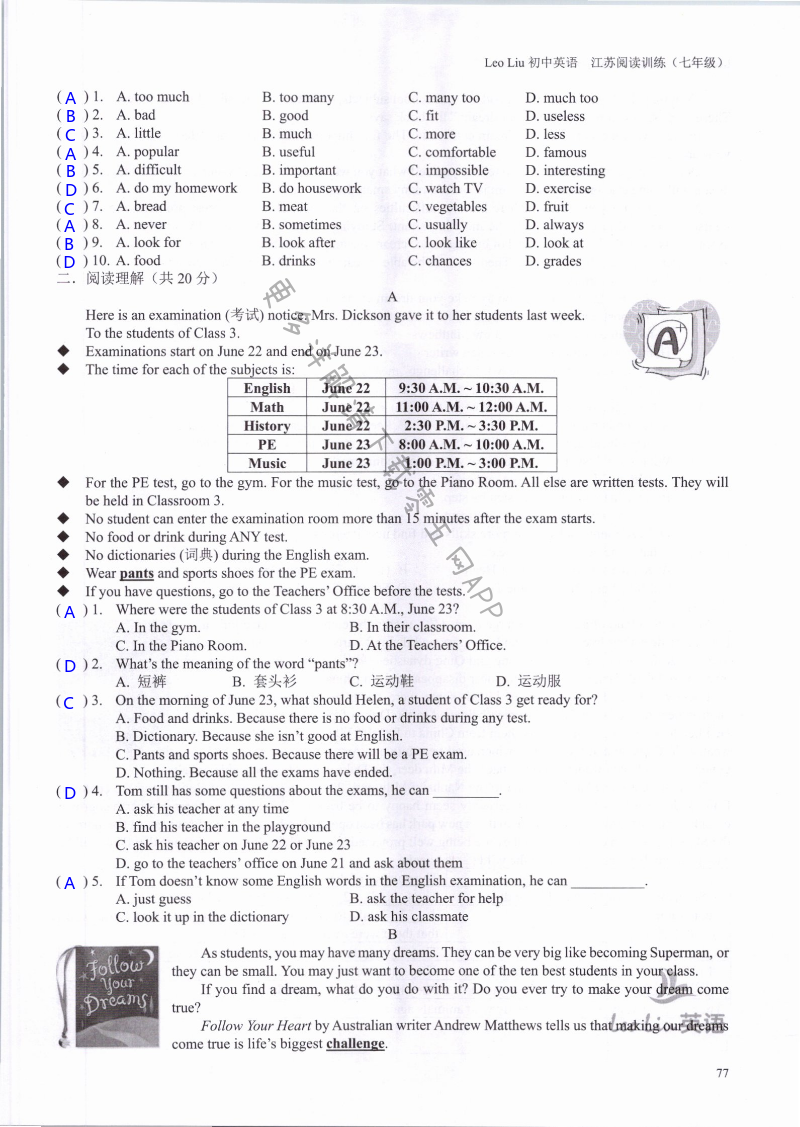 注:目前有些书本章节名称可能整理的还不是很完善,但都是按照顺序排列的,请同学们按照顺序仔细查找。练习册 2021年LeoLiu初中英语七年级听力训练阅读训练 答案主要是用来给同学们做完题方便对答案用的,请勿直接抄袭。