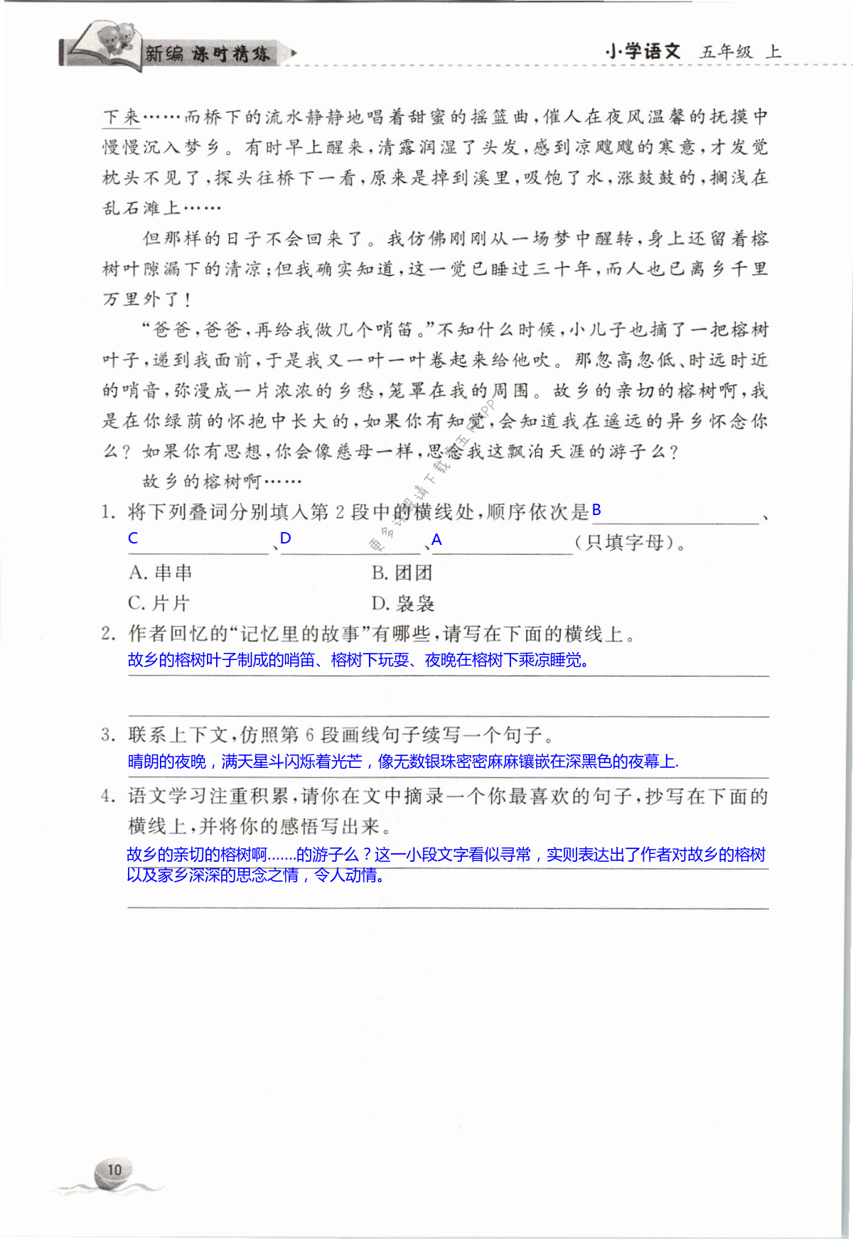 注:目前有些书本章节名称可能整理的还不是很完善,但都是按照顺序排列的,请同学们按照顺序仔细查找。练习册 2021年新编课时精练小学语文五年级上册人教版 答案主要是用来给同学们做完题方便对答案用的,请勿直接抄袭。