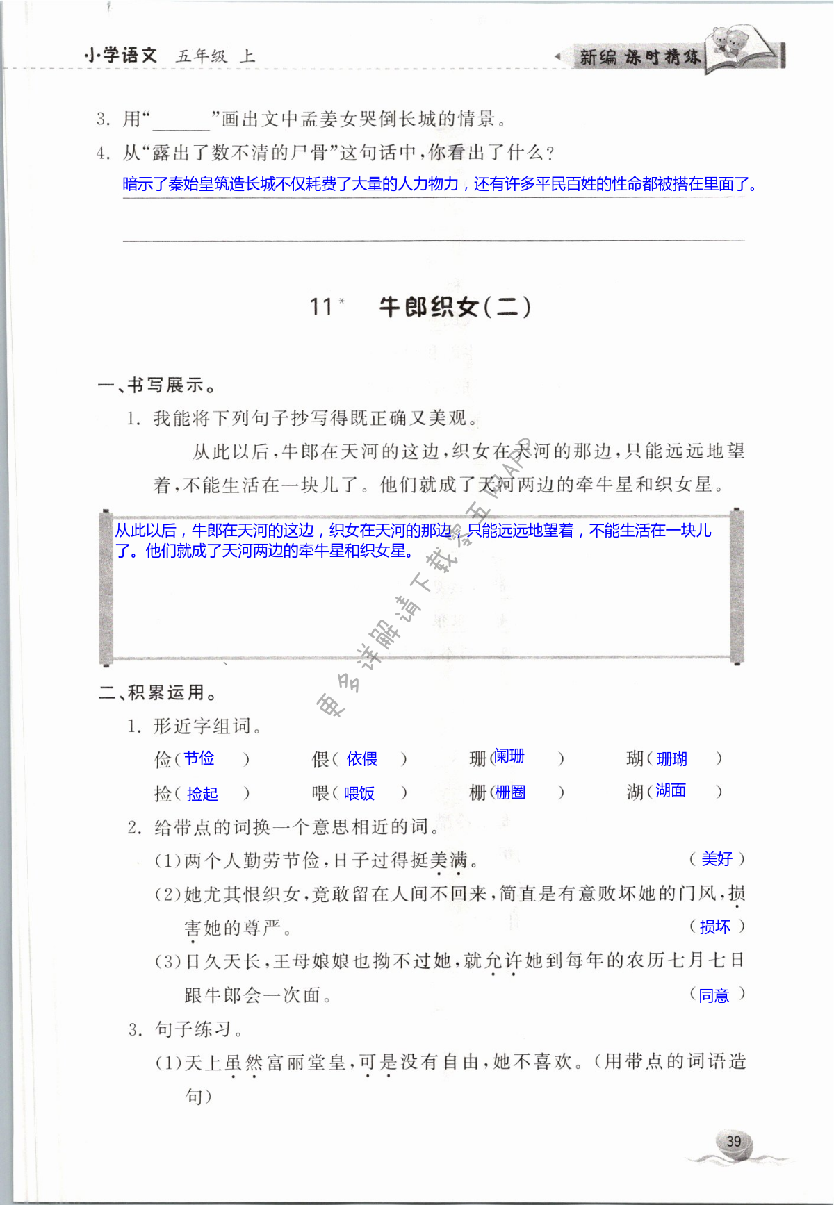 注:目前有些书本章节名称可能整理的还不是很完善,但都是按照顺序排列的,请同学们按照顺序仔细查找。练习册 2021年新编课时精练小学语文五年级上册人教版 答案主要是用来给同学们做完题方便对答案用的,请勿直接抄袭。
