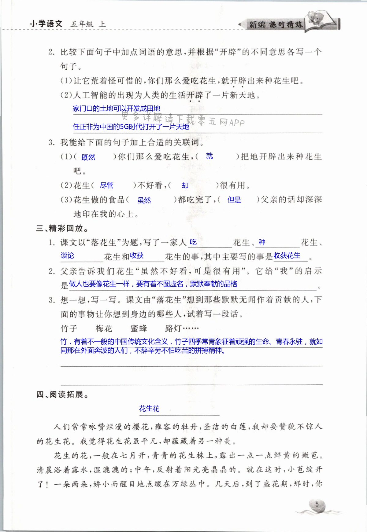 注:目前有些书本章节名称可能整理的还不是很完善,但都是按照顺序排列的,请同学们按照顺序仔细查找。练习册 2021年新编课时精练小学语文五年级上册人教版 答案主要是用来给同学们做完题方便对答案用的,请勿直接抄袭。
