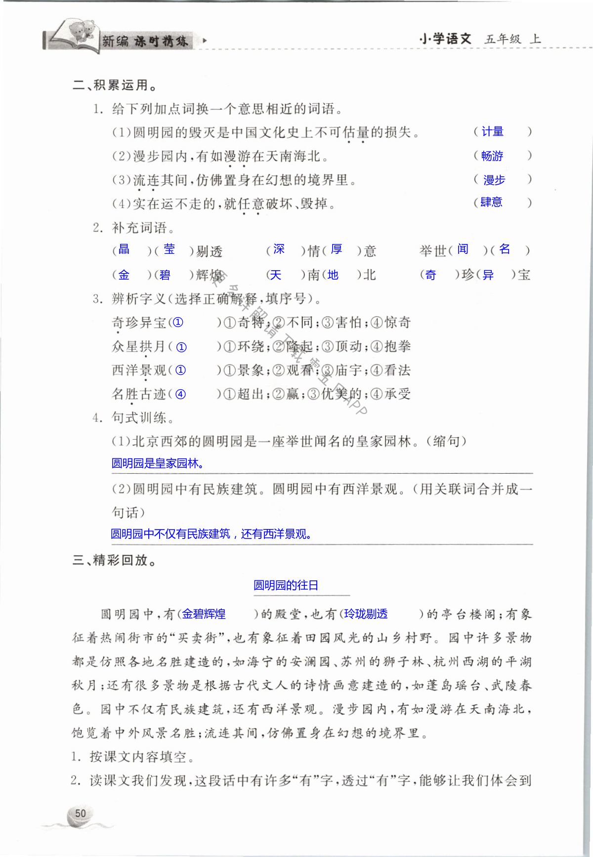 注:目前有些书本章节名称可能整理的还不是很完善,但都是按照顺序排列的,请同学们按照顺序仔细查找。练习册 2021年新编课时精练小学语文五年级上册人教版 答案主要是用来给同学们做完题方便对答案用的,请勿直接抄袭。