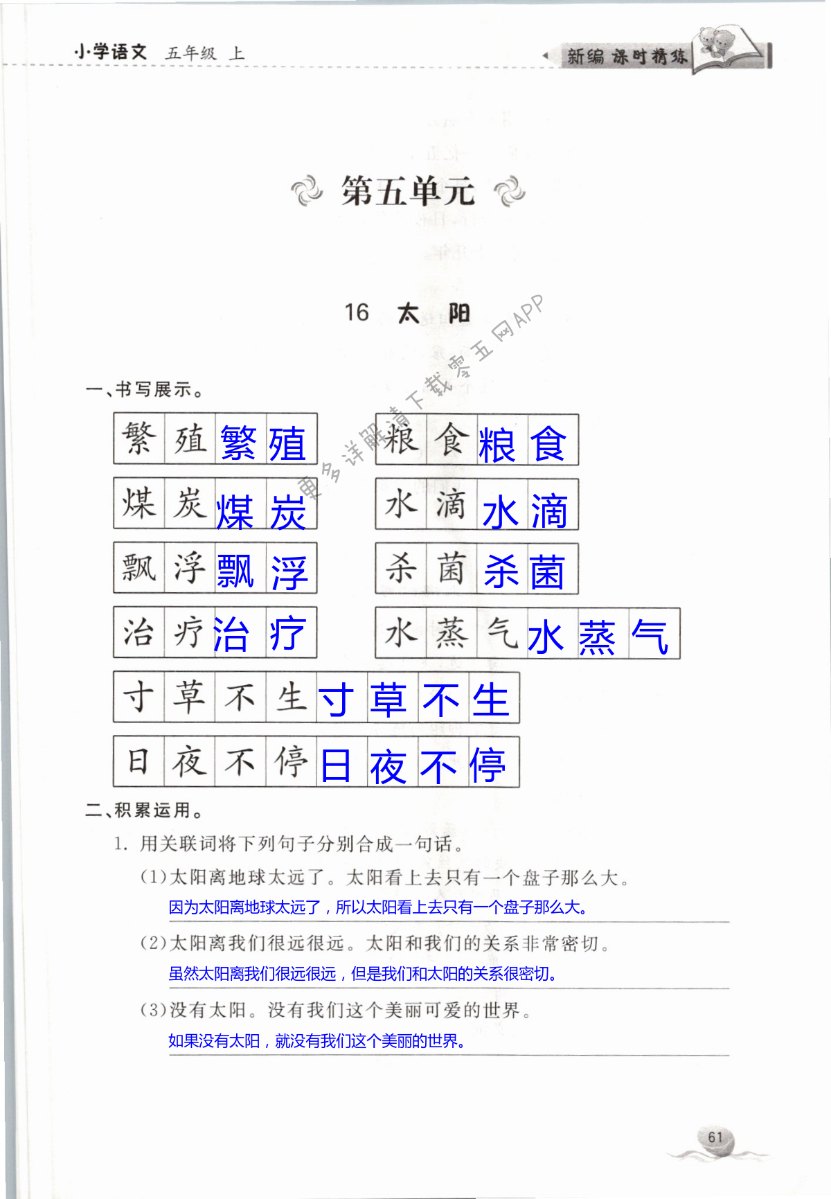 注:目前有些书本章节名称可能整理的还不是很完善,但都是按照顺序排列的,请同学们按照顺序仔细查找。练习册 2021年新编课时精练小学语文五年级上册人教版 答案主要是用来给同学们做完题方便对答案用的,请勿直接抄袭。