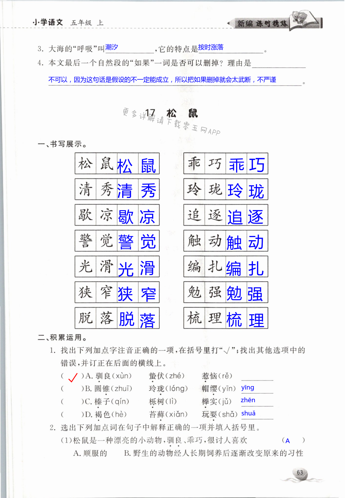注:目前有些书本章节名称可能整理的还不是很完善,但都是按照顺序排列的,请同学们按照顺序仔细查找。练习册 2021年新编课时精练小学语文五年级上册人教版 答案主要是用来给同学们做完题方便对答案用的,请勿直接抄袭。
