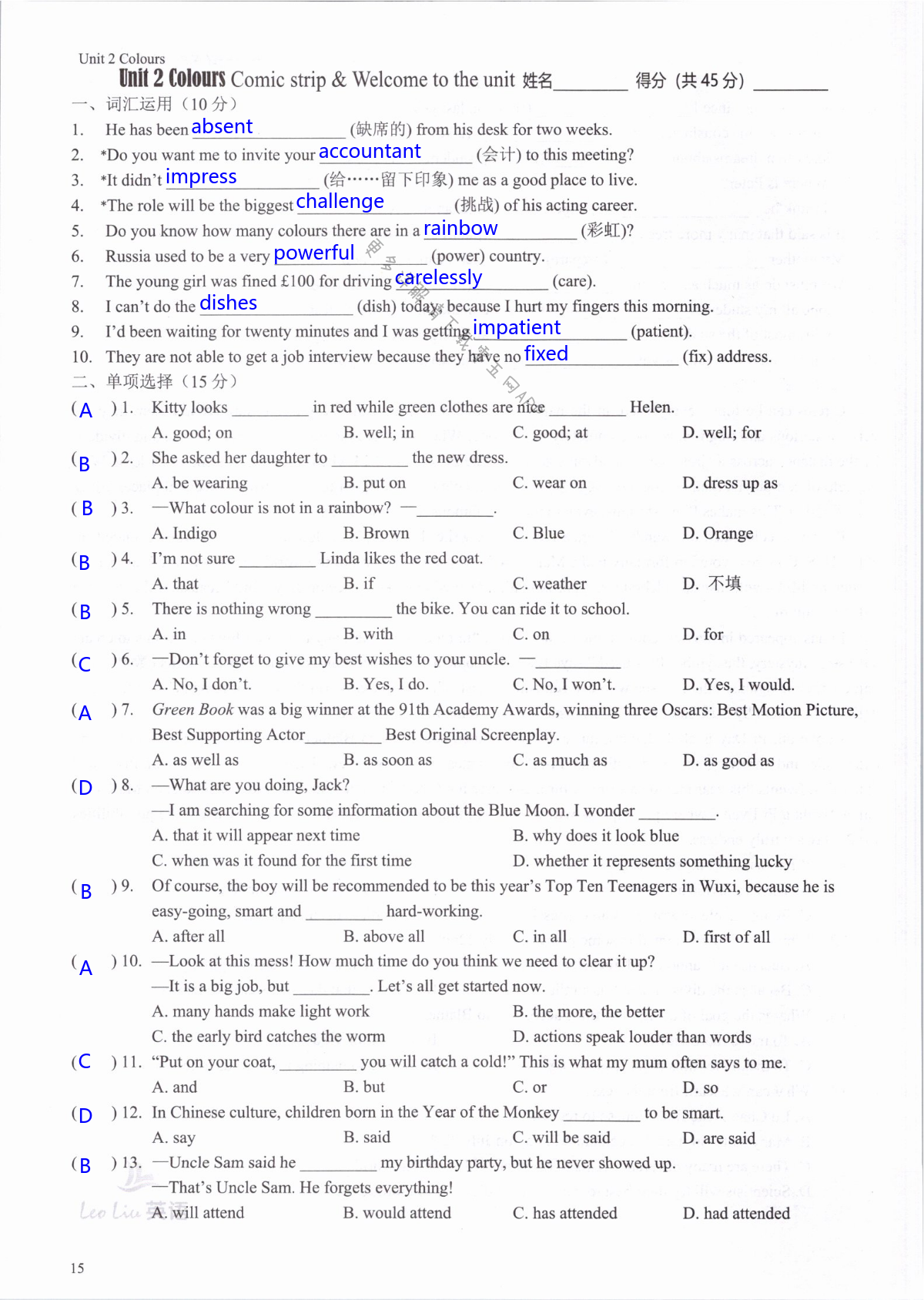 注:目前有些书本章节名称可能整理的还不是很完善,但都是按照顺序排列的,请同学们按照顺序仔细查找。练习册 2021年LeoLiu中学英语九年级上册译林版 答案主要是用来给同学们做完题方便对答案用的,请勿直接抄袭。