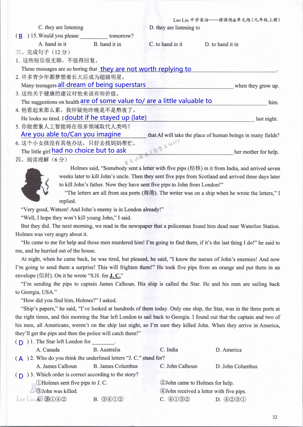注:目前有些书本章节名称可能整理的还不是很完善,但都是按照顺序排列的,请同学们按照顺序仔细查找。练习册 2021年LeoLiu中学英语九年级上册译林版 答案主要是用来给同学们做完题方便对答案用的,请勿直接抄袭。