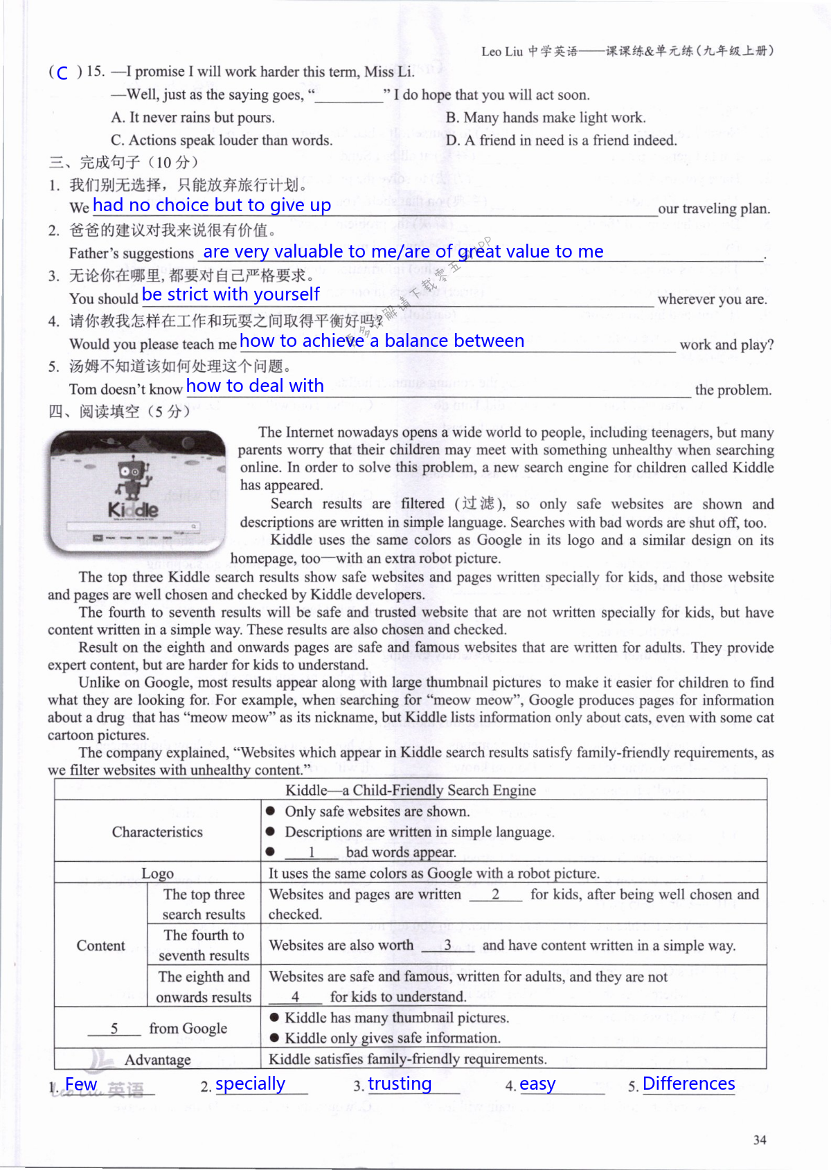 注:目前有些书本章节名称可能整理的还不是很完善,但都是按照顺序排列的,请同学们按照顺序仔细查找。练习册 2021年LeoLiu中学英语九年级上册译林版 答案主要是用来给同学们做完题方便对答案用的,请勿直接抄袭。