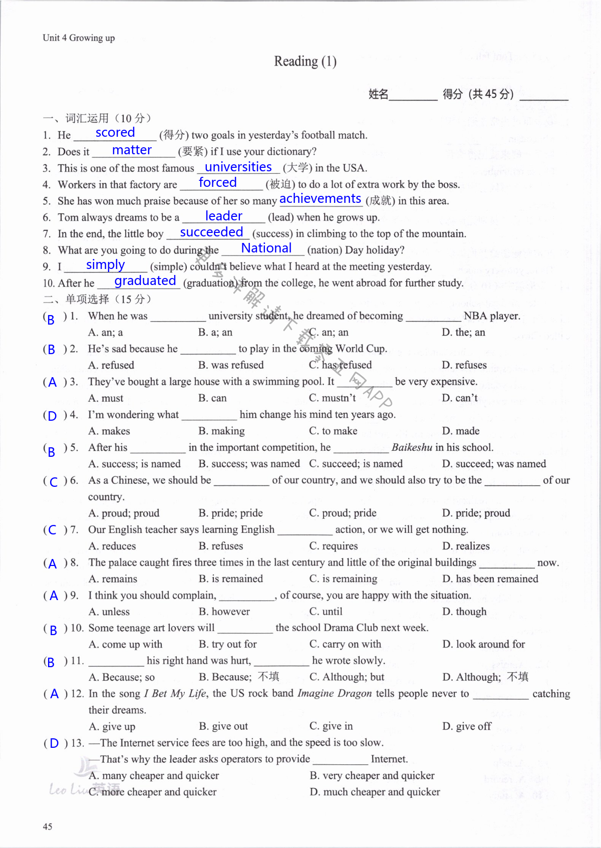注:目前有些书本章节名称可能整理的还不是很完善,但都是按照顺序排列的,请同学们按照顺序仔细查找。练习册 2021年LeoLiu中学英语九年级上册译林版 答案主要是用来给同学们做完题方便对答案用的,请勿直接抄袭。