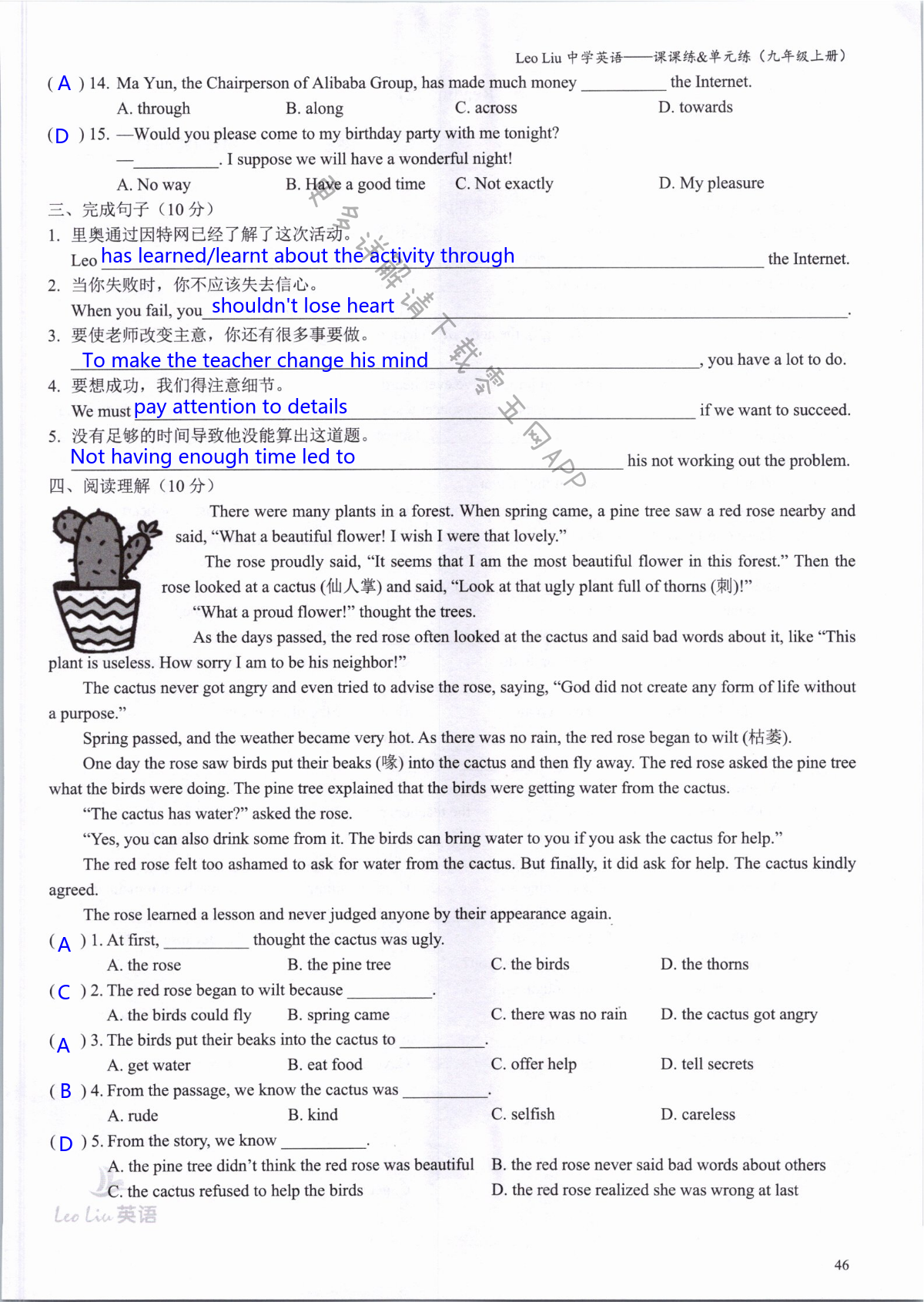 注:目前有些书本章节名称可能整理的还不是很完善,但都是按照顺序排列的,请同学们按照顺序仔细查找。练习册 2021年LeoLiu中学英语九年级上册译林版 答案主要是用来给同学们做完题方便对答案用的,请勿直接抄袭。