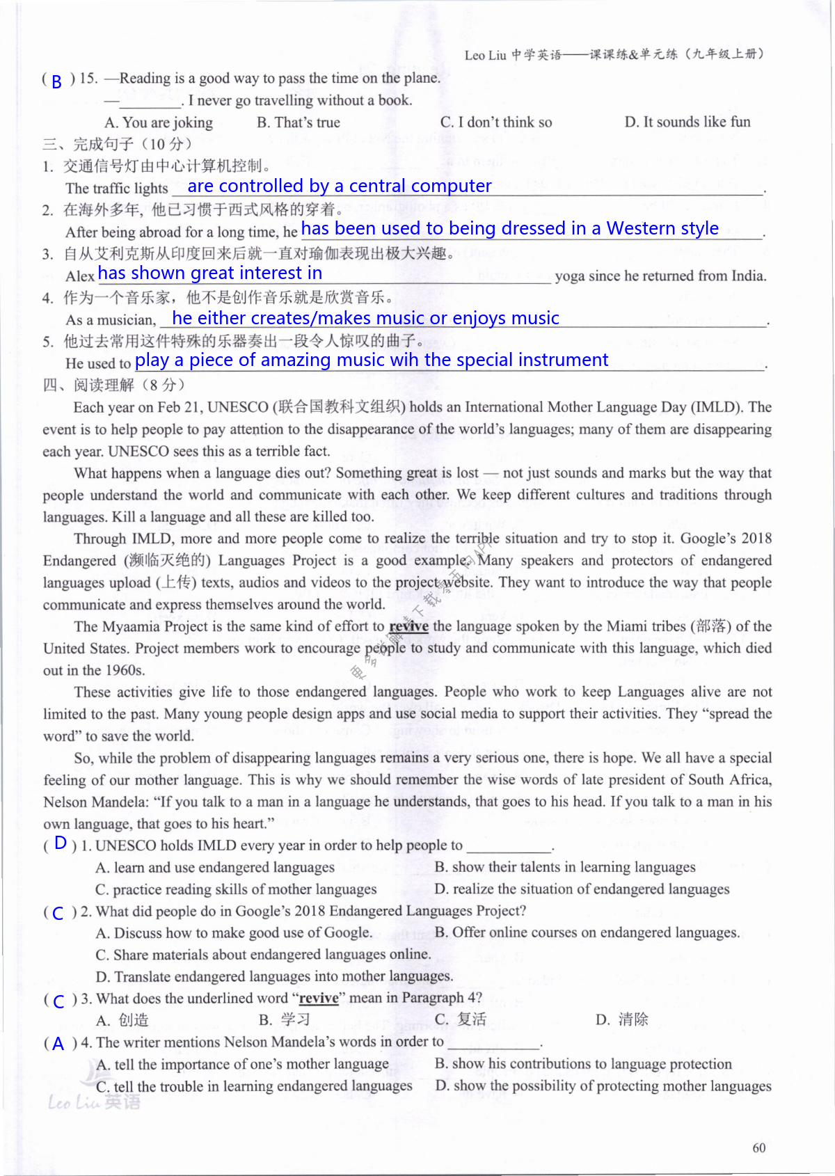注:目前有些书本章节名称可能整理的还不是很完善,但都是按照顺序排列的,请同学们按照顺序仔细查找。练习册 2021年LeoLiu中学英语九年级上册译林版 答案主要是用来给同学们做完题方便对答案用的,请勿直接抄袭。