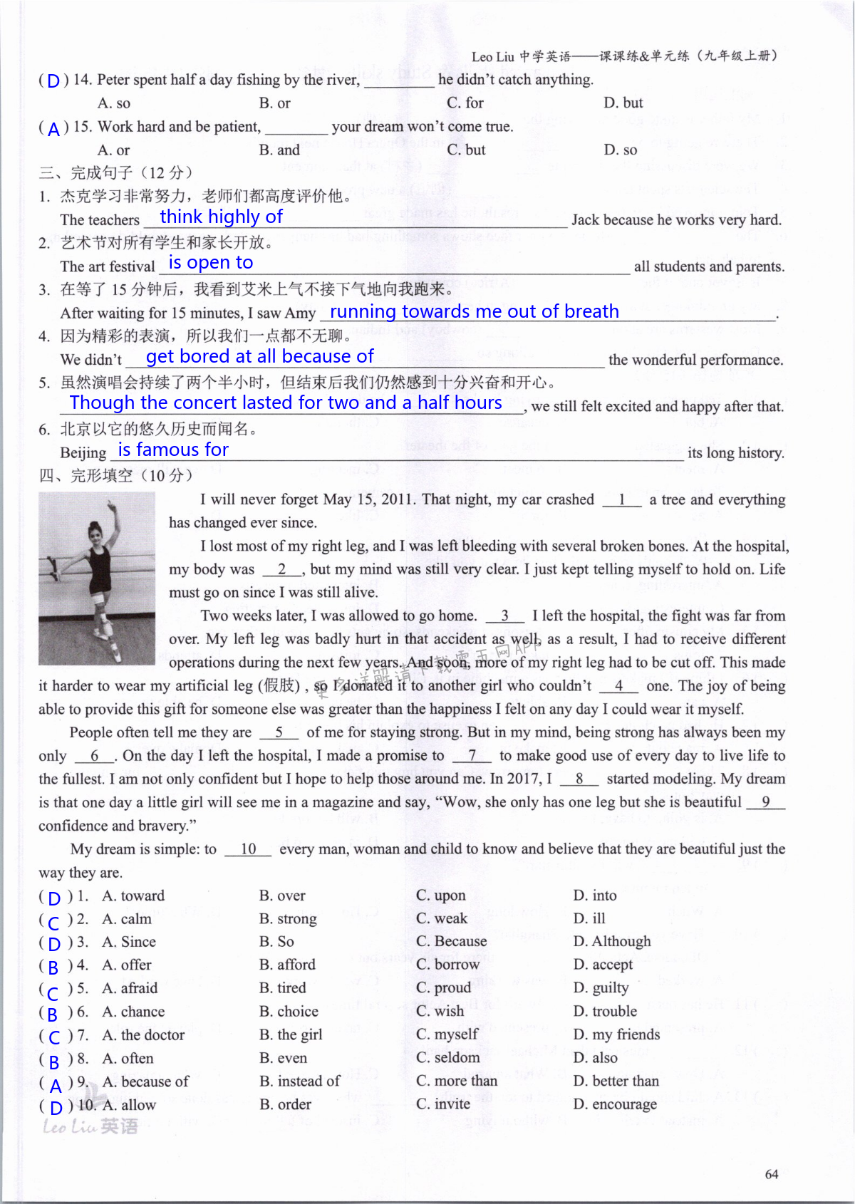 注:目前有些书本章节名称可能整理的还不是很完善,但都是按照顺序排列的,请同学们按照顺序仔细查找。练习册 2021年LeoLiu中学英语九年级上册译林版 答案主要是用来给同学们做完题方便对答案用的,请勿直接抄袭。
