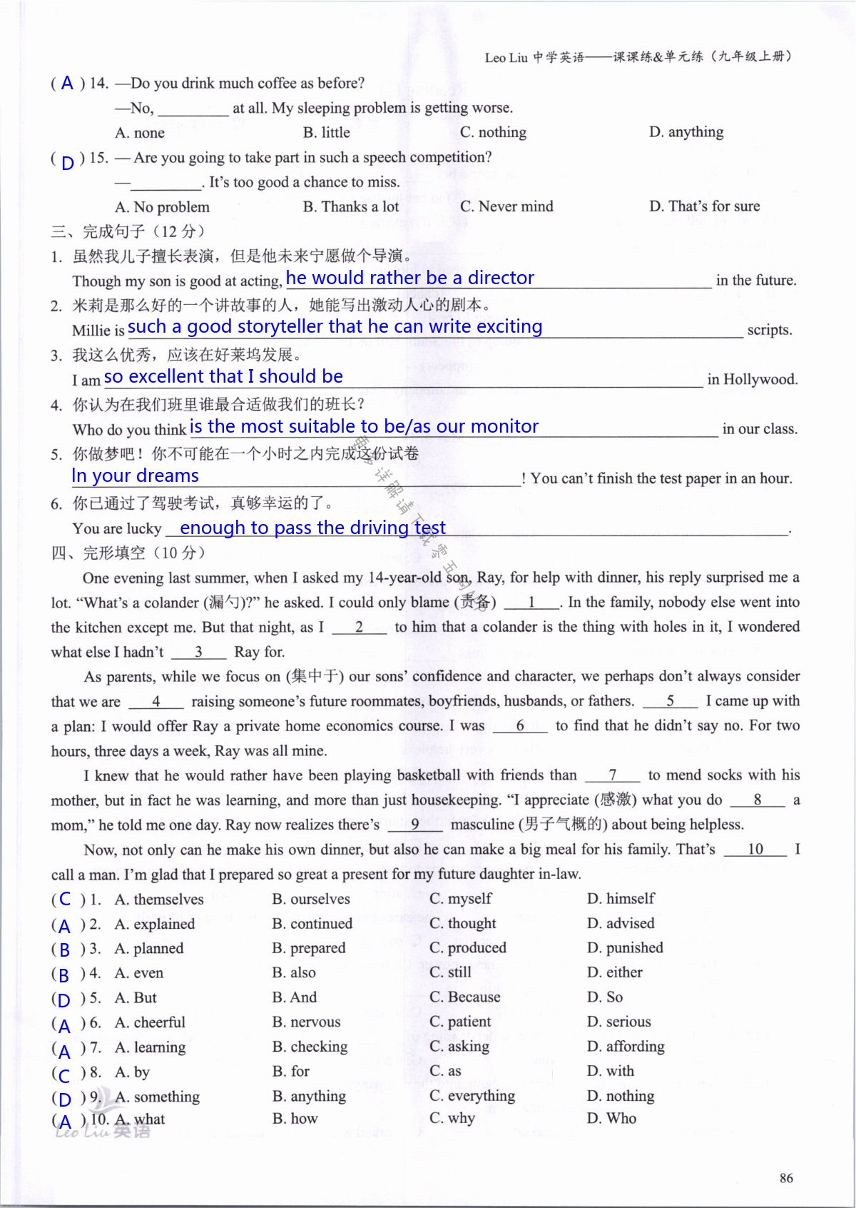 注:目前有些书本章节名称可能整理的还不是很完善,但都是按照顺序排列的,请同学们按照顺序仔细查找。练习册 2021年LeoLiu中学英语九年级上册译林版 答案主要是用来给同学们做完题方便对答案用的,请勿直接抄袭。
