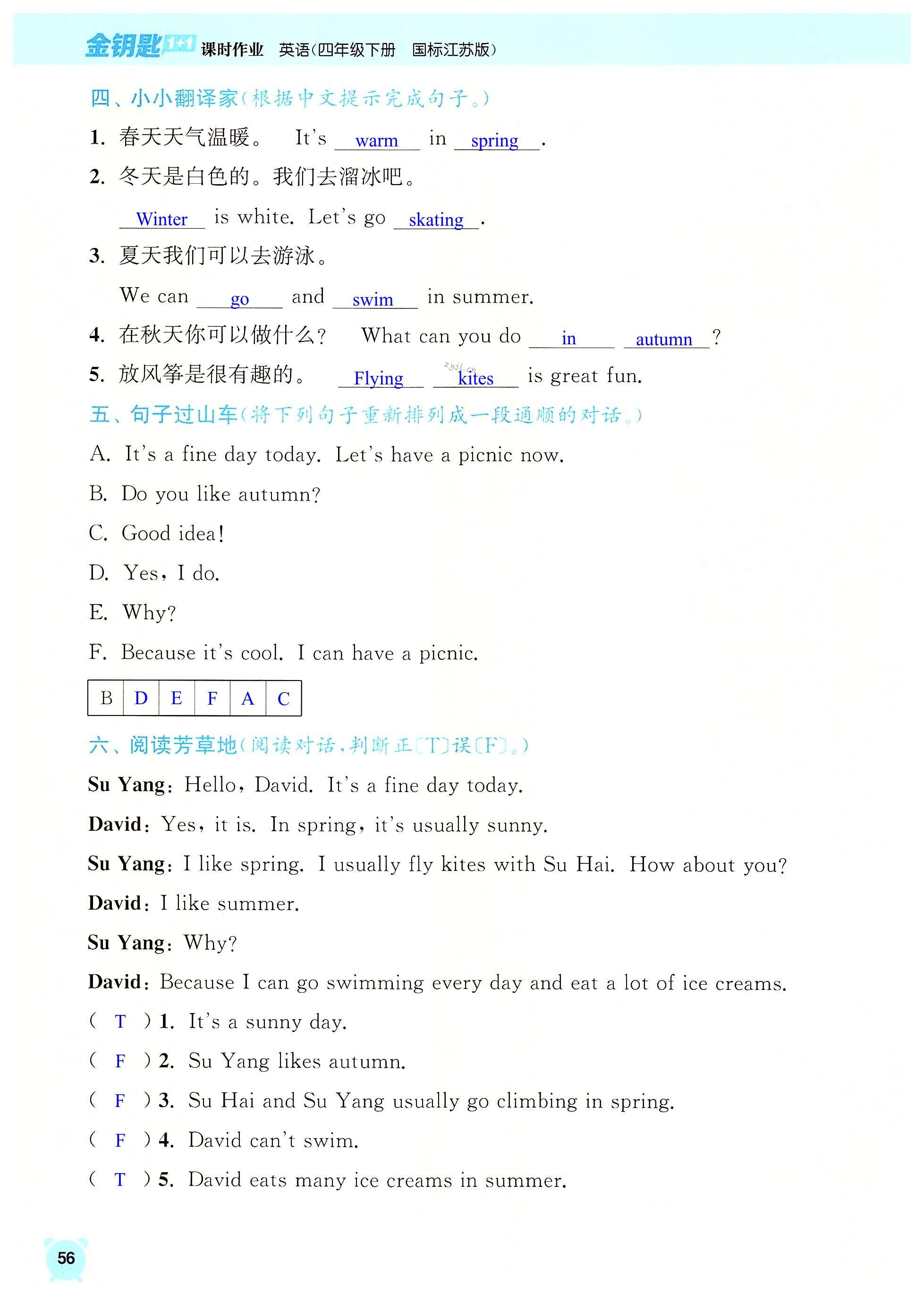 注:目前有些书本章节名称可能整理的还不是很完善,但都是按照顺序排列的,请同学们按照顺序仔细查找。练习册 2022年金钥匙1加1课时作业四年级英语下册江苏版 答案主要是用来给同学们做完题方便对答案用的,请勿直接抄袭。