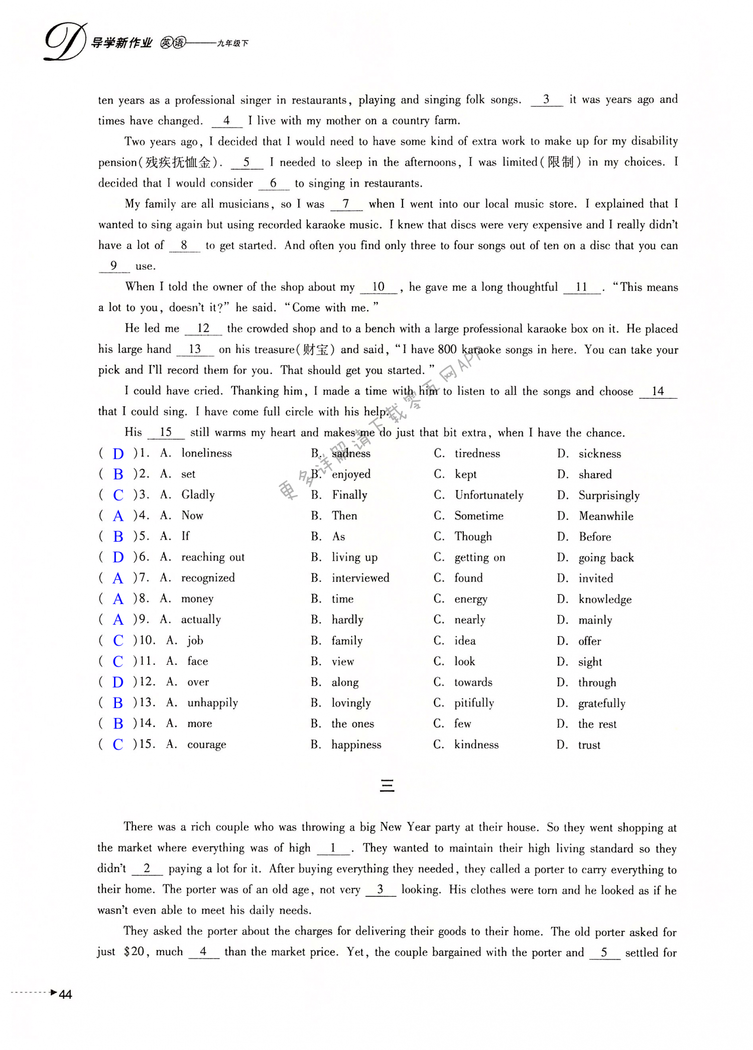 注:目前有些书本章节名称可能整理的还不是很完善,但都是按照顺序排列的,请同学们按照顺序仔细查找。练习册 2022年导学新作业九年级英语下册人教版 答案主要是用来给同学们做完题方便对答案用的,请勿直接抄袭。
