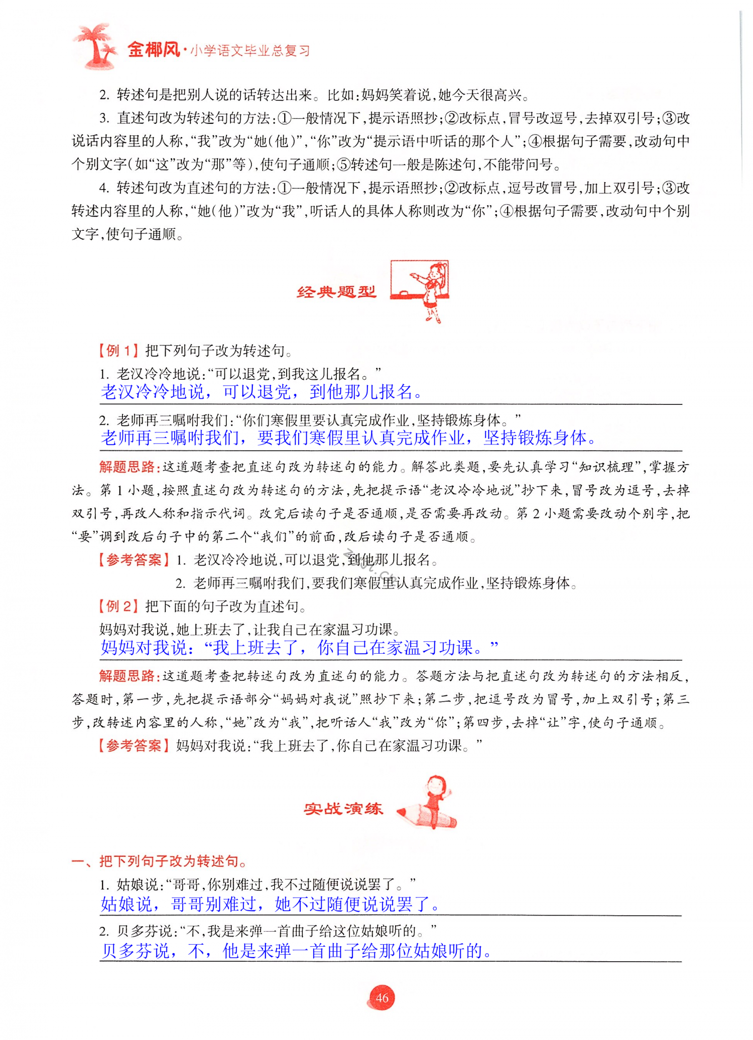 注:目前有些书本章节名称可能整理的还不是很完善,但都是按照顺序排列的,请同学们按照顺序仔细查找。练习册 2022年金椰风小学毕业总复习六年级语文人教版 答案主要是用来给同学们做完题方便对答案用的,请勿直接抄袭。