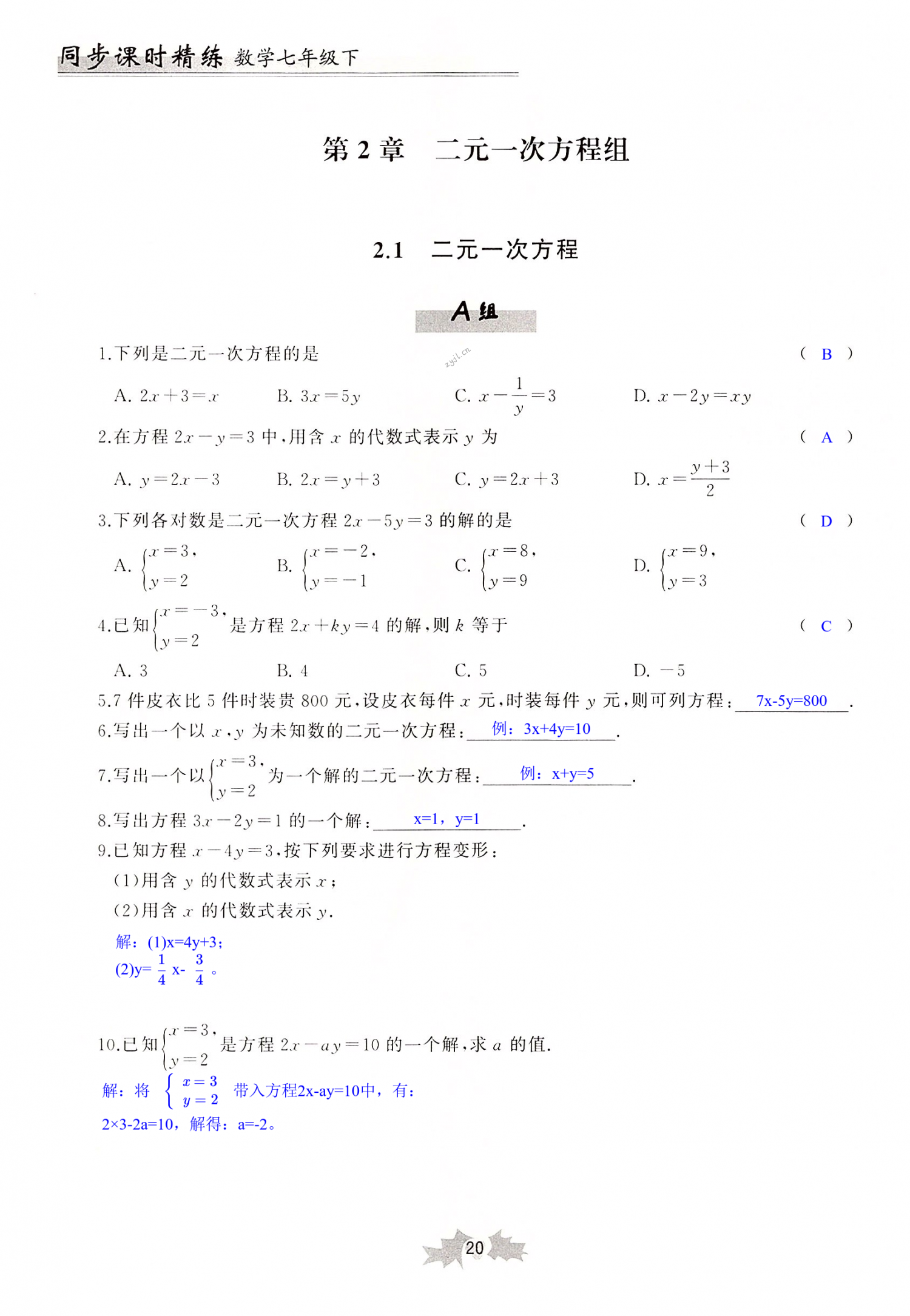 注:目前有些书本章节名称可能整理的还不是很完善,但都是按照顺序排列的,请同学们按照顺序仔细查找。练习册 2022年同步课时精练七年级数学下册浙教版 答案主要是用来给同学们做完题方便对答案用的,请勿直接抄袭。