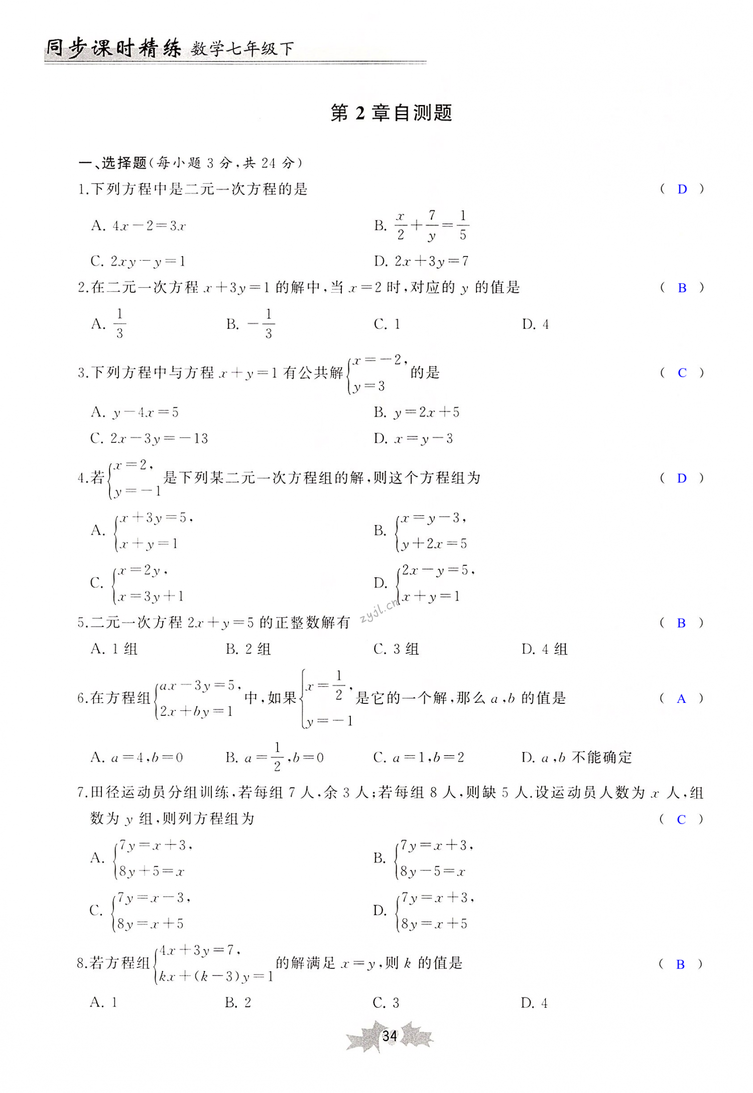 注:目前有些书本章节名称可能整理的还不是很完善,但都是按照顺序排列的,请同学们按照顺序仔细查找。练习册 2022年同步课时精练七年级数学下册浙教版 答案主要是用来给同学们做完题方便对答案用的,请勿直接抄袭。