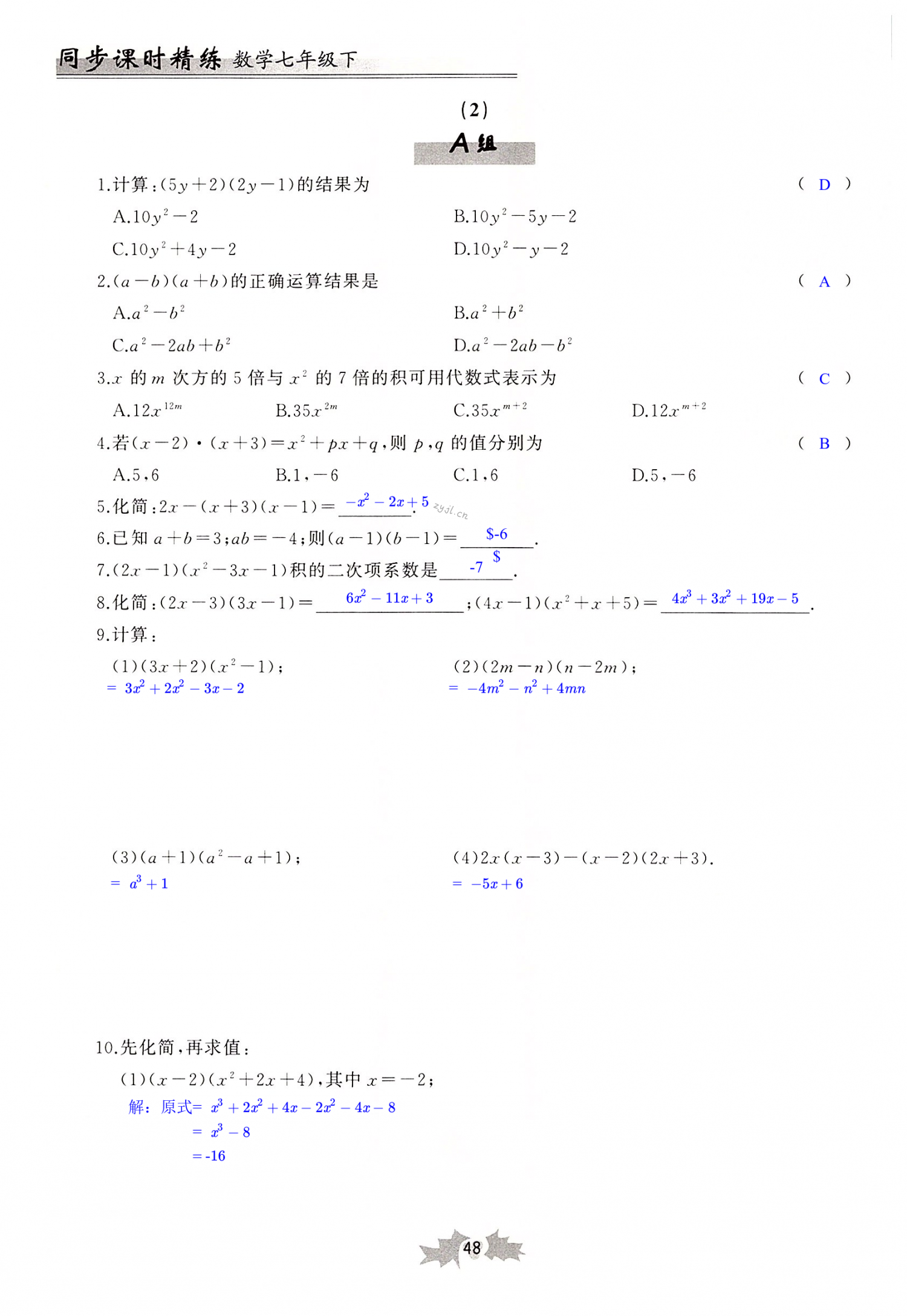 注:目前有些书本章节名称可能整理的还不是很完善,但都是按照顺序排列的,请同学们按照顺序仔细查找。练习册 2022年同步课时精练七年级数学下册浙教版 答案主要是用来给同学们做完题方便对答案用的,请勿直接抄袭。