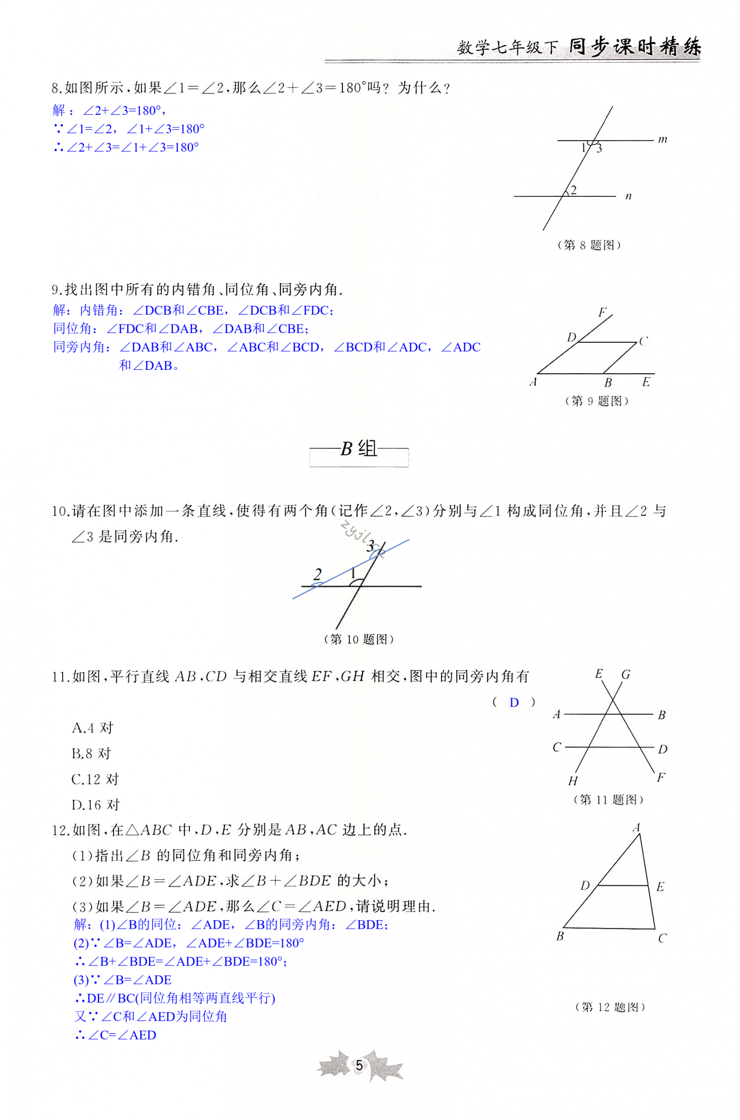 注:目前有些书本章节名称可能整理的还不是很完善,但都是按照顺序排列的,请同学们按照顺序仔细查找。练习册 2022年同步课时精练七年级数学下册浙教版 答案主要是用来给同学们做完题方便对答案用的,请勿直接抄袭。