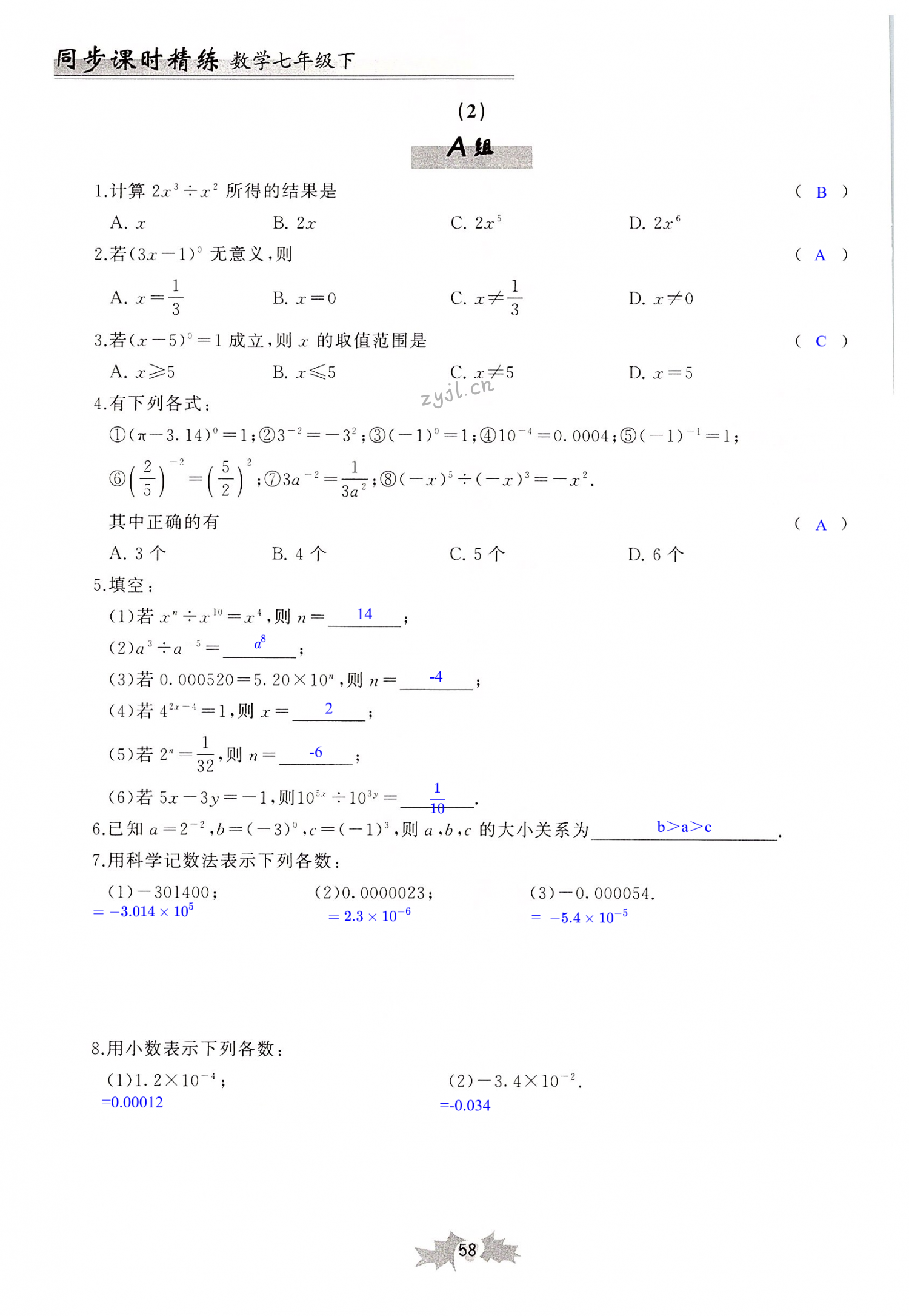 注:目前有些书本章节名称可能整理的还不是很完善,但都是按照顺序排列的,请同学们按照顺序仔细查找。练习册 2022年同步课时精练七年级数学下册浙教版 答案主要是用来给同学们做完题方便对答案用的,请勿直接抄袭。