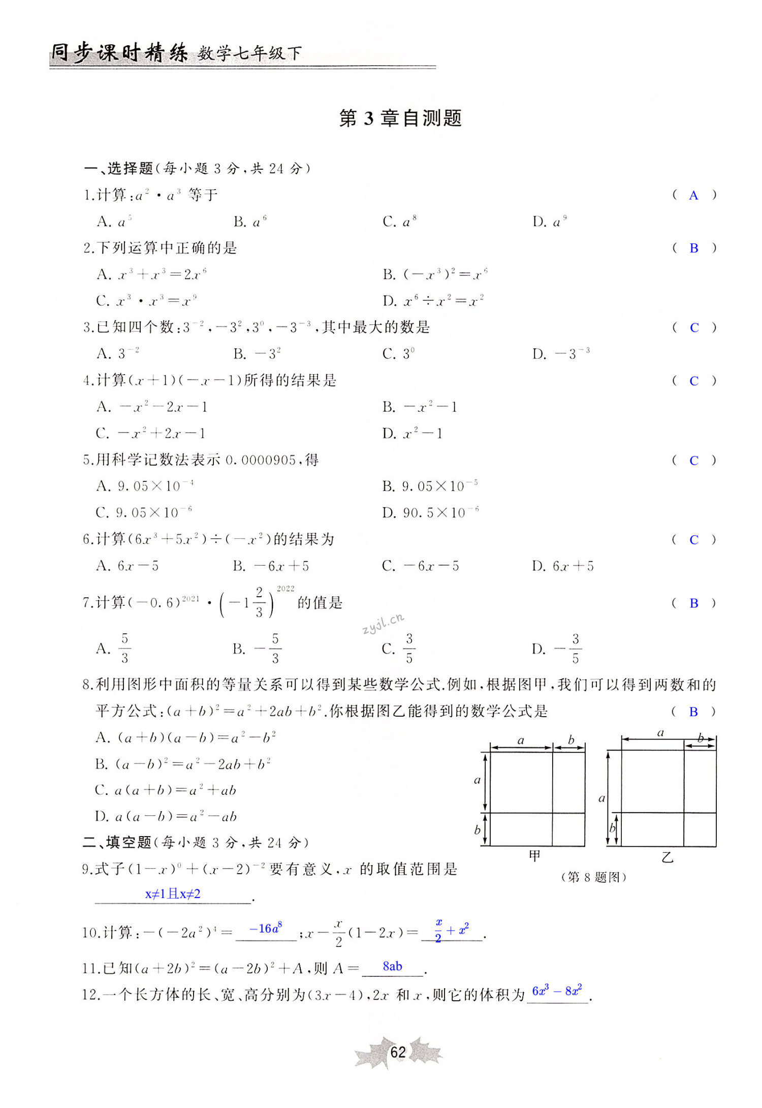 注:目前有些书本章节名称可能整理的还不是很完善,但都是按照顺序排列的,请同学们按照顺序仔细查找。练习册 2022年同步课时精练七年级数学下册浙教版 答案主要是用来给同学们做完题方便对答案用的,请勿直接抄袭。